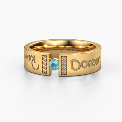 Ein einzigartiger Gold Trauring mit Blau Topas! Was diesen WH2094L16C Damen Trauring so besonders macht ist, dass er mit einem speziellen Text graviert werden kann, der für Sie von Bedeutung ist. Ein Wort, ein kurzer Satz, oder der Teil eines Liedtextes. Welcher Text auch immer für Sie am wichtigsten ist. Erinnern Sie sich daran mit einer exquisiten Gravur in diesem moderne Trauring. Dieser eigenem Text Damen Trauring hat eine Breite von ±6 mm. Sie können in unserem Online-Tool eine Kombination aus Edelmetallen wählen. Alles ist möglich! Es ist gut, sich die Eigenschaften der verschiedenen Edelmetalle anzusehen. Gold und Silber sind zum Beispiel weichere Metalle. Die Karat werden durch die Menge der hinzugefügten zusätzlichen Metalle bestimmt. Wenn der Goldschmied nicht viel hinzufügt, sind die Karat höher und der Trauring wird weicher. Wenn er mehr Metalle hinzufügt, hat das Schmuckstück einen geringeren Wert in Karat. Ein weicheres Edelmetall kann trotzdem für Ihre moderne Trauring verwendet werden! Wenn Sie ein Edelmetall bevorzugen, das ein Leben lang halten wird, empfehlen wir Platin. Es ist das robusteste und langlebigste Metall, dass unser Goldschmied verwendet.Dieser Trauring kann auch als Inspirationsquelle dienen. Möchtest du den Ring matt oder glänzend (ohne Aufpreis) haben, oder lieber breiter oder schmaler? Alles ist möglich. Da es unzählige Variationen gibt, können wir nicht alles auf unserer Website zeigen. Hast du eine Idee für schöne Trauringe oder irgendwo anders ein schönes Set Trauringe gesehen? Kontaktiere uns gerne, unsere Designer stehen bereit, um dir zu helfen.Mit unserer modernen Technik, kombiniert mit Handwerk, können wir Schmuckstücke von höchster Qualität mit größter Sorgfalt für Sie entwerfen und anpassen. Unsere Trauringe sind immer um 30 Prozent günstiger als bei anderen Juwelieren. Wir fertigen Trauringe auf Bestellung, also müssen wir keine großen Lager unterhalten.Um es einfacher zu machen, bieten wir eine kostenlose 30-tägige Rücksendung.