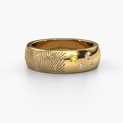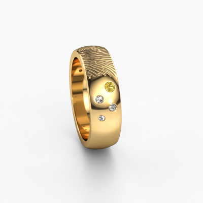 Qu'y a-t-il de plus unique qu'une empreinte digitale ? C'est la raison pour laquelle cette alliance pour unisexe en or jaune avec saphir jaune est si spéciale. La propre empreinte de votre amoureux, gravée dans le symbole de votre amour éternel l'un pour l'autre. Que pensez-vous de la beauté de pouvoir mettre cette alliance modernes au doigt de votre partenaire le jour de votre mariage ? Comment ça marche ? Vous commandez d’abord l'alliance que vous souhaitez et comme vous la souhaitez. Après l'avoir commandée, envoyez-nous un email avec l'empreinte digitale. Comment vous pouvez le faire : vous pouvez le lire au bas de cette page de notre base de connaissances. La largeur de cette alliance est de ±6 mm. Une fois que vous aurez composé votre bague, notre créateur de bijoux se mettra au travail. Il fera un dessin en 3D de votre alliance. Nous pouvons également utiliser ce dessin pour créer une bague factice. Vous aurez la possibilité de commander cette bague factice pour que vous puissiez voir à l'avance comment votre bague sera. Par la suite, notre orfèvre qualifié fabriquera votre bague dans notre atelier. Nous utilisons de l'or issue du commerce équitable, de telle sorte que vous puissiez obtenir une bague dont nous sommes fiers de sa composition et de son apparence. Vous pouvez également nous remettre votre propre or. Parce que nous fabriquons votre bague à la main, nous pouvons en effet utiliser votre propre or. Notre objectif est de créer une belle alliance brillante comme vous le souhaitiez !Au fait, vous pouvez être inspiré par cette bague et l'ajuster ultérieurement à votre goût. Préférez-vous un anneau plus mince ou plus large ? Préférez-vous une bague plus brillante ou mate ? Tout est possible. Aussi, si vous avez une idée de vos propres alliances extraordinaires, ou si vous avez vu un bel ensemble ailleurs qui vous plait beaucoup et que vous souhaitez personnaliser à votre goût : pas de problème ! N'hésitez pas à nous contacter. Nos designers se feront un plaisir de discuter de vos possibilités avec vous !Puisque nous concevons et livrons nos propres alliances, nous sommes en mesure de vous proposer une alliance à un prix que vous ne pourrez pas trouver ailleurs. Une alliance est fabriquée sur commande, ce qui permet d'éviter les excédents de matériel et nous permet de vous proposer une superbe offre de prix. Nous comprenons qu'acheter votre alliance en ligne soit un risque, mais nous vous assistons volontiers dans le processus de conception, en tenant compte de votre budget.Pour vous faciliter la tâche, vous pouvez facilement nous retourner tout bijou commandé dans les 30 jours suivant la livraison.