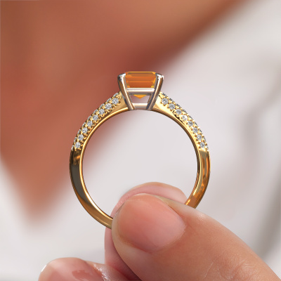 La bague de fiançailles mentionnée ci-dessus a été nommée Morane EME. Ce type de bague de fiançailles est appelé une bague de fiançailles solitaire pavé car elle ne comporte qu’une seule pierre centrale et les tiges de la bague de fiançailles sont également pleins. La bague de fiançailles est faite dans une combinaison d'or 14 Carat et d’or blanc et a un citrine taille émeraude d’une de 8x6 mm, et des diamants synthétiques sont sertis sur les épaules de l’anneau. Chaque bijou est fabriquée spécialement pour vous par nos maîtres orfèvres dans notre propre atelier. Cette bague de fiançailles solitaire pavé forgée en or jaune uniques a un beau citrines taille émeraude comme pierre centrale, avec plus de citrines sertis dans la bague pour accentuer encore plus la présence de la pierre centrale. Le sertissage à griffes autour du citrine étant ouvert, le citrine capte la lumière de tous les côtés et brille de manière optimale. Ci-dessus, vous pouvez voir comment notre orfèvre travaille la bague de fiançailles avec une extrême précision dans les moindres détails, de telle sorte que le citrine élevé puisse attirer tous les regards. Quelle belle bague de fiançailles à offrir lors de votre demande en mariage à l'amour de votre vie, à votre centre rayonnant ! Saviez-vous que nous offrons la garantie du meilleur prix pour votre bague de fiançailles? Cela est possible car tous nos bijoux sont fabriqués à la main dans notre propre atelier. Nous n'avons pas de frais de stocks qui sont coûteux, et nous fabriquons votre bague uniquement une fois que vous l'avez commandée. Grâce au fait que nous ayons toute la production du bijou en main, nous pouvons vous informer sur toutes les caractéristiques de cette bague de fiançailles. C’est précisément parce que l’achat d’une bague en ligne est une expérience excitante que nous comprenons qu’il est plus confortable pour vous de connaître toutes les caractéristiques de votre bague.Notre équipe ajoute quotidiennement de nouveaux modèles à notre collection en ligne. Nos designers et orfèvres travaillent ensemble pour créer le meilleur design. Nous nous efforçons d'offrir une collection diversifiée de bijoux. Peut-être avez-vous déjà en tête un bijou en particulier ? Un bijou que vous avez trouvé quelque part. Veuillez nous contacter pour une consultation gratuite. Nous vous ferons une offre, basée sur un rapport qualité / prix juste, qui vous déconcertera.Pour vous faciliter la tâche, vous pouvez facilement nous retourner tout bijou commandé dans les 30 jours suivant la livraison.