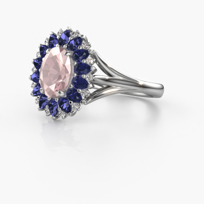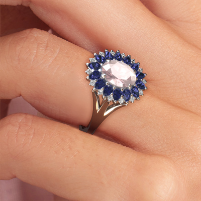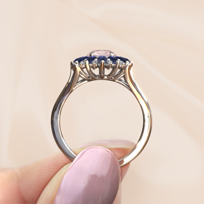 La bague de fiançailles présentée ci-dessus a été nommée Lidia. Nous appelons ce type de bague de fiançailles une bague entourage. Ici, de petites pierres précieuses sont serties autour de la pierre centrale dans un sertissage ouvert. Cette bague de fiançailles forgée en or 14 Carat a un champagne morganite ovale de 8x6 mm en guise de pierre centrale qui est aussi entourée de petits saphir. Les petites pierres précieuses qui sont serties autour du large champagne morganite sous la forme d’une belle fleur rendent cette bague de fiançailles entourage forgée en or blanc vintage si spéciale. Ils donnent l'effet de former une grosse pierre précieuse étincelante. Cette bague de fiançailles peut aussi avoir un autre nom tel que bague fleur ou la bague rosette. Cependant, ces petits champagne morganite doivent tous être sertis de la même manière, afin que la lumière pénétrant dans le champagne morganite ne soit pas interrompue et qu'une belle unité soit effectivement créée. Voici donc le travail de nos maîtres orfèvres. Avec la plus grande précision, chaque champagne morganite soigneusement sélectionné est serti à la main dans la bague de fiançailles. Toujours et encore, la bague de fiançailles est examinée sous la lumière pour voir si l'effet spécial désiré est encore visible. Le résultat est donc une bague de fiançailles unique, où le champagne morganite choisi devient littéralement le centre brillants. Vous pouvez imaginer que cette bague de fiançailles est vraiment une bague de fiançailles significative à offrir à votre amour de votre vie ! Le jour où vous lui montrerez qu'elle est le centre brillants de votre vie ! Ce bijou est faite avec passion et amour par l'un de nos maîtres orfèvres.En combinant les dernières techniques modernes, associées à une fabrication ancienne, nous sommes en mesure de fabriquer nos bagues de fiançailles dans notre propre studio. Chaque bijou est fabriqué sur commande. Ceci est avantageux car nous sommes en mesure de vous proposer un prix que vous ne trouverez nulle part ailleurs.Avez-vous déjà des bague de fiançailles spécifiques en tête ? Une bague de fiançailles que vous avez vu quelque part. N'hésitez pas à nous faire part de vos souhaits et nous transformerons votre design en des bague de fiançailles uniques. Vous êtes en mesure de suivre l'évolution de la conception de vos bague de fiançailles car nous utilisons des dessins en 3D. Cela vous donnera un aperçu réaliste de votre design. Nous vous enverrons volontiers une offre sans engagement basée sur un rapport qualité / prix juste. Elle va vous étonner.Pour vous faciliter la tâche, vous pouvez facilement nous retourner tout bijou commandé dans les 30 jours suivant la livraison.