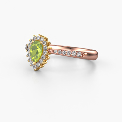La bague de fiançailles présentée ci-dessus a été nommée Tilly per 2. Nous appelons ce type de bague de fiançailles une bague entourage. Ici, de petites pierres précieuses sont serties autour de la pierre centrale dans un sertissage ouvert. Cette bague de fiançailles forgée en or 14 Carat a un péridot poire de 6x4 mm en guise de pierre centrale qui est aussi entourée de petits diamants. Les petites pierres précieuses qui sont serties autour du large péridot sous la forme d’une belle fleur rendent cette bague de fiançailles entourage forgée en or rose exclusives si spéciale. Ils donnent l'effet de former une grosse pierre précieuse étincelante. Cette bague de fiançailles peut aussi avoir un autre nom tel que bague fleur ou la bague rosette. Cependant, ces petits péridots doivent tous être sertis de la même manière, afin que la lumière pénétrant dans le péridot ne soit pas interrompue et qu'une belle unité soit effectivement créée. Voici donc le travail de nos maîtres orfèvres. Avec la plus grande précision, chaque péridot soigneusement sélectionné est serti à la main dans la bague de fiançailles. Toujours et encore, la bague de fiançailles est examinée sous la lumière pour voir si l'effet spécial désiré est encore visible. Le résultat est donc une bague de fiançailles unique, où le péridot choisi devient littéralement le centre brillants. Vous pouvez imaginer que cette bague de fiançailles est vraiment une bague de fiançailles significative à offrir à votre amour de votre vie ! Le jour où vous lui montrerez qu'elle est le centre brillants de votre vie ! Ce bijou est faite spécialement pour vous, avec une attention particulière portée aux détails et au design.Saviez-vous que nous offrons la garantie du meilleur prix pour votre bague de fiançailles? Cela est possible car tous nos bijoux sont fabriqués à la main dans notre propre atelier. Nous n'avons pas de frais de stocks qui sont coûteux, et nous fabriquons votre bague uniquement une fois que vous l'avez commandée. Grâce au fait que nous ayons toute la production du bijou en main, nous pouvons vous informer sur toutes les caractéristiques de cette bague de fiançailles. C’est précisément parce que l’achat d’une bague en ligne est une expérience excitante que nous comprenons qu’il est plus confortable pour vous de connaître toutes les caractéristiques de votre bague.Notre équipe ajoute quotidiennement de nouveaux modèles à notre collection en ligne. Nos designers et orfèvres travaillent ensemble pour créer le meilleur design. Nous nous efforçons d'offrir une collection diversifiée de bijoux. Peut-être avez-vous déjà en tête un bijou en particulier ? Un bijou que vous avez trouvé quelque part. Veuillez nous contacter pour une consultation gratuite. Nous vous ferons une offre, basée sur un rapport qualité / prix juste, qui vous déconcertera.Pour vous faciliter la tâche, vous pouvez facilement nous retourner tout bijou commandé dans les 30 jours suivant la livraison.