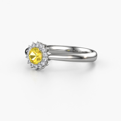 La bague de fiançailles présentée ci-dessus a été nommée Tilly RND 1. Nous appelons ce type de bague de fiançailles une bague entourage. Ici, de petites pierres précieuses sont serties autour de la pierre centrale dans un sertissage ouvert. Cette bague de fiançailles forgée en or 14 Carat a un saphir jaune ronds de 4.2 mm en guise de pierre centrale qui est aussi entourée de petits diamants. Les petites pierres précieuses qui sont serties autour du large saphir jaune sous la forme d’une belle fleur rendent cette bague de fiançailles entourage forgée en or blanc classiques si spéciale. Ils donnent l'effet de former une grosse pierre précieuse étincelante. Cette bague de fiançailles peut aussi avoir un autre nom tel que bague fleur ou la bague rosette. Cependant, ces petits saphirs jaunes doivent tous être sertis de la même manière, afin que la lumière pénétrant dans le saphir jaune ne soit pas interrompue et qu'une belle unité soit effectivement créée. Voici donc le travail de nos maîtres orfèvres. Avec la plus grande précision, chaque saphir jaune soigneusement sélectionné est serti à la main dans la bague de fiançailles. Toujours et encore, la bague de fiançailles est examinée sous la lumière pour voir si l'effet spécial désiré est encore visible. Le résultat est donc une bague de fiançailles unique, où le saphir jaune choisi devient littéralement le centre brillants. Vous pouvez imaginer que cette bague de fiançailles est vraiment une bague de fiançailles significative à offrir à votre amour de votre vie ! Le jour où vous lui montrerez qu'elle est le centre brillants de votre vie ! Ce bijou est fabriquées avec passion et amour par l'un de nos maîtres orfèvres.En combinant les dernières techniques modernes, associées à une fabrication ancienne, nous sommes en mesure de fabriquer nos bagues de fiançailles dans notre propre studio. Chaque bijou est fabriqué sur commande. Ceci est avantageux car nous sommes en mesure de vous proposer un prix que vous ne trouverez nulle part ailleurs.Notre équipe ajoute quotidiennement de nouveaux modèles à notre collection en ligne. Nos designers et orfèvres travaillent ensemble pour créer le meilleur design. Nous nous efforçons d'offrir une collection diversifiée de bijoux. Peut-être avez-vous déjà en tête un bijou en particulier ? Un bijou que vous avez trouvé quelque part. Veuillez nous contacter pour une consultation gratuite. Nous vous ferons une offre, basée sur un rapport qualité / prix juste, qui vous déconcertera.Pour vous faciliter la tâche, vous pouvez facilement nous retourner tout bijou commandé dans les 30 jours suivant la livraison.