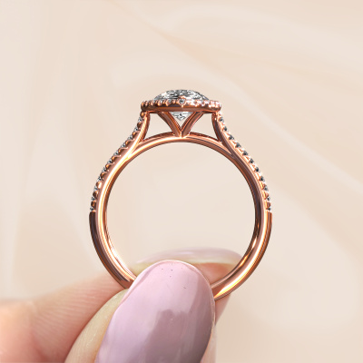 La bague de fiançailles mentionnée ci-dessus est nommée Seline per 2. Nous appelons ce type de bague de fiançailles une bague Halo. La bague de fiançailles est forgée en or 14 Carat et comporte un diamant synthétique poire de la de 1.00 crt et autour duquel sont sertis de petits diamants. La largeur de cette bague de fiançailles halo forgée en or rose classiques vient des plus petites pierres précieuses qui sont serties autour du large diamant synthétique central. C’est également ce à partir de quoi cette belle bague de fiançailles tire son nom : halo signifie halo et c’est aussi l’effet que rendent les pierres précieuses plus petites. Cependant, ces pierres précieuses plus petites doivent toutes être serties de la même manière, afin que la lumière ne soit pas seulement introduite dans le diamant synthétique et qu’un véritable halo de lumière soit créé. Et c'est ce que font nos maîtres orfèvres. Avec la plus grande précision, chaque diamant synthétique soigneusement sélectionné est placé à la main dans la bague de fiançailles. Encore et encore, la bague de fiançailles est maintenue à la lumière pour voir si l'effet spécial est toujours visible. Le résultat est une bague de fiançailles unique, où le diamant synthétique choisi devient littéralement le centre brillants. Vous pouvez imaginer que cette bague de fiançailles est vraiment une bague de fiançailles significative à offrir à votre amour de la vie ! Le jour où vous montrez qu’elle est votre centre brillants ! Puisque nous concevons et livrons nos propres bijoux, nous sommes en mesure de vous proposer une bague de fiançailles à un prix que vous ne pourrez pas trouver ailleurs. Une alliance est fabriquée sur commande, ce qui permet d'éviter les excédents de matériel et nous permet de vous proposer une superbe offre de prix. Nous comprenons qu'acheter votre bague de fiançailles en ligne soit un risque, mais nous vous assistons volontiers dans le processus de conception, en tenant compte de votre budget.Notre équipe de designers talentueux et passionnés ajoute chaque jour de nouveaux modèles bague de fiançailles à notre collection en ligne. Notre objectif est de pouvoir vous offrir une grande variété de bijoux. N'hésitez pas à demander un devis si vous avez des souhaits spécifiques pour votre bague de fiançailles. Nous garantissons de vous faire une offre que vous ne pourrez pas refuser.Pour vous faciliter la tâche, vous pouvez facilement nous retourner tout bijou commandé dans les 30 jours suivant la livraison.
