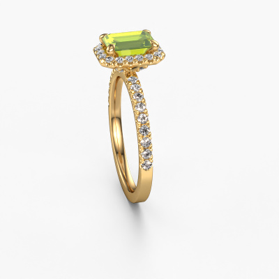 La bague de fiançailles mentionnée ci-dessus est nommée Miranda eme. Nous appelons ce type de bague de fiançailles une bague Halo. La bague de fiançailles est forgée en or 14 Carat et comporte un péridot taille émeraude de la de 7x5 mm et autour duquel sont sertis de petits diamants. La largeur de cette bague de fiançailles halo forgée en or jaune classiques vient des plus petites pierres précieuses qui sont serties autour du large péridot central. C’est également ce à partir de quoi cette belle bague de fiançailles tire son nom : halo signifie halo et c’est aussi l’effet que rendent les pierres précieuses plus petites. Cependant, ces pierres précieuses plus petites doivent toutes être serties de la même manière, afin que la lumière ne soit pas seulement introduite dans le péridot et qu’un véritable halo de lumière soit créé. Et c'est ce que font nos maîtres orfèvres. Avec la plus grande précision, chaque péridot soigneusement sélectionné est placé à la main dans la bague de fiançailles. Encore et encore, la bague de fiançailles est maintenue à la lumière pour voir si l'effet spécial est toujours visible. Le résultat est une bague de fiançailles unique, où le péridot choisi devient littéralement le centre brillants. Vous pouvez imaginer que cette bague de fiançailles est vraiment une bague de fiançailles significative à offrir à votre amour de la vie ! Le jour où vous montrez qu’elle est votre centre brillants ! En combinant les dernières techniques modernes, associées à une fabrication ancienne, nous sommes en mesure de fabriquer nos bagues de fiançailles dans notre propre studio. Chaque bijou est fabriqué sur commande. Ceci est avantageux car nous sommes en mesure de vous proposer un prix que vous ne trouverez nulle part ailleurs.Notre équipe de designers talentueux et passionnés ajoute chaque jour de nouveaux modèles bague de fiançailles à notre collection en ligne. Notre objectif est de pouvoir vous offrir une grande variété de bijoux. N'hésitez pas à demander un devis si vous avez des souhaits spécifiques pour votre bague de fiançailles. Nous garantissons de vous faire une offre que vous ne pourrez pas refuser.Pour vous faciliter la tâche, vous pouvez facilement nous retourner tout bijou commandé dans les 30 jours suivant la livraison.