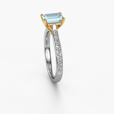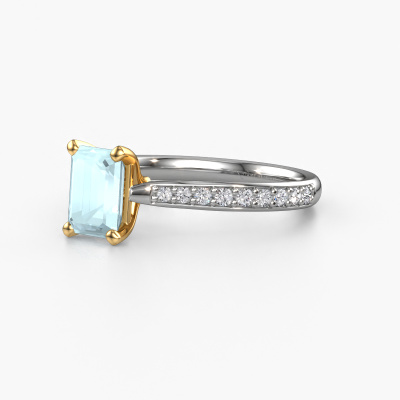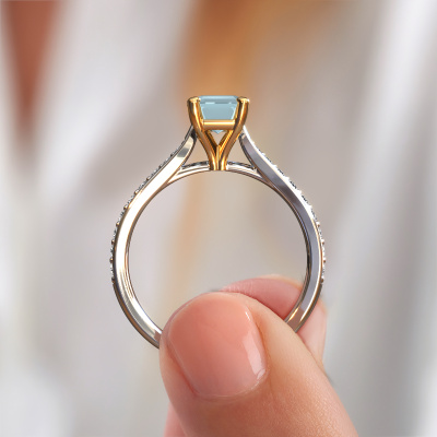 La bague de fiançailles mentionnée ci-dessus a été nommée Mignon eme 2. Ce type de bague de fiançailles est appelé une bague de fiançailles solitaire pavé car elle ne comporte qu’une seule pierre centrale et les tiges de la bague de fiançailles sont également pleins. La bague de fiançailles est faite dans une combinaison d'or 14 Carat et d’or jaune et a un aigue-marine taille émeraude d’une de 7x5 mm, et des diamants synthétiques sont sertis sur les épaules de l’anneau. Chaque bijou est faite spécialement pour vous, avec une attention particulière portée aux détails et au design. Cette bague de fiançailles solitaire pavé forgée en or blanc exclusives a un beau aigues-marines taille émeraude comme pierre centrale, avec plus de aigues-marines sertis dans la bague pour accentuer encore plus la présence de la pierre centrale. Le sertissage à griffes autour du aigue-marine étant ouvert, le aigue-marine capte la lumière de tous les côtés et brille de manière optimale. Ci-dessus, vous pouvez voir comment notre orfèvre travaille la bague de fiançailles avec une extrême précision dans les moindres détails, de telle sorte que le aigue-marine élevé puisse attirer tous les regards. Quelle belle bague de fiançailles à offrir lors de votre demande en mariage à l'amour de votre vie, à votre centre rayonnant ! Vous avez peut-être remarqué que nos prix sont en moyenne inférieurs de 30% à ceux d'un autre bijoutier. Et ce alors que la qualité de nos bijoux est même plus élevée dans la plupart des cas ! En effet, nos orfèvres fabriquent votre bague de fiançailles directement dans notre propre atelier. Cela signifie que nous n'avons pas à inclure des frais de stocks coûteux et que nous pouvons travailler n'importe quel détail directement sur votre bague de fiançailles.Avez-vous déjà des bague de fiançailles spécifiques en tête ? Une bague de fiançailles que vous avez vu quelque part. N'hésitez pas à nous faire part de vos souhaits et nous transformerons votre design en des bague de fiançailles uniques. Vous êtes en mesure de suivre l'évolution de la conception de vos bague de fiançailles car nous utilisons des dessins en 3D. Cela vous donnera un aperçu réaliste de votre design. Nous vous enverrons volontiers une offre sans engagement basée sur un rapport qualité / prix juste. Elle va vous étonner.Pour vous faciliter la tâche, vous pouvez facilement nous retourner tout bijou commandé dans les 30 jours suivant la livraison.