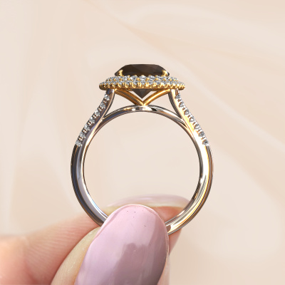 La bague de fiançailles mentionnée ci-dessus est nommée Elvie. Nous appelons ce type de bague de fiançailles une bague Halo. La bague de fiançailles est forgée en or 14 Carat et comporte un quartz fumé ovale de la de 10x8 mm et autour duquel sont sertis de petits diamants synthétiques. La largeur de cette bague de fiançailles solitaire pavé forgée en or blanc vintage vient des plus petites pierres précieuses qui sont serties autour du large quartz fumé central. C’est également ce à partir de quoi cette belle bague de fiançailles tire son nom : solitaire pavé signifie halo et c’est aussi l’effet que rendent les pierres précieuses plus petites. Cependant, ces pierres précieuses plus petites doivent toutes être serties de la même manière, afin que la lumière ne soit pas seulement introduite dans le quartz fumé et qu’un véritable halo de lumière soit créé. Et c'est ce que font nos maîtres orfèvres. Avec la plus grande précision, chaque quartz fumé soigneusement sélectionné est placé à la main dans la bague de fiançailles. Encore et encore, la bague de fiançailles est maintenue à la lumière pour voir si l'effet spécial est toujours visible. Le résultat est une bague de fiançailles unique, où le quartz fumé choisi devient littéralement le centre brillants. Vous pouvez imaginer que cette bague de fiançailles est vraiment une bague de fiançailles significative à offrir à votre amour de la vie ! Le jour où vous montrez qu’elle est votre centre brillants ! Qu'y a-t-il dorénavant de plus beau qu'une bague de fiançailles vintage conçue par vous-même et fabriquée à la main par nous. Vous pouvez personnaliser chaque modèle avec les différents métaux précieux et pierres précieuses. De cette façon, vous pourrez créer une bague de fiançailles unique. Cette bague peut être mise en place de plusieurs façons. Bien sûr, vous pouvez toujours nous contacter et nous serons heureux de vous aider à composer votre bague de fiançailles vintage Elvie. Vous aimez le design, mais vous souhaitez tout de même quelque chose qui vous convienne plus, ou bien vous souhaitez une pierre précieuse dans les bijoux que vous ne pouvez pas choisir sur notre site, contactez-nous et nous vous aiderons.Avez-vous déjà des bague de fiançailles spécifiques en tête ? Une bague de fiançailles que vous avez vu quelque part. N'hésitez pas à nous faire part de vos souhaits et nous transformerons votre design en des bague de fiançailles uniques. Vous êtes en mesure de suivre l'évolution de la conception de vos bague de fiançailles car nous utilisons des dessins en 3D. Cela vous donnera un aperçu réaliste de votre design. Nous vous enverrons volontiers une offre sans engagement basée sur un rapport qualité / prix juste. Elle va vous étonner.Pour vous faciliter la tâche, vous pouvez facilement nous retourner tout bijou commandé dans les 30 jours suivant la livraison.
