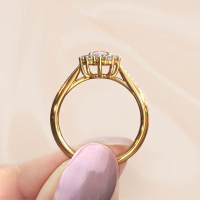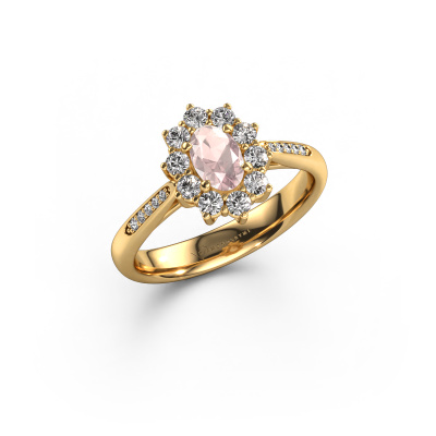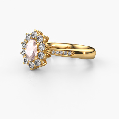 La bague de fiançailles présentée ci-dessus a été nommée Leesa 2. Nous appelons ce type de bague de fiançailles une bague entourage, dans laquelle de petites pierres précieuses sont serties autour de la pierre centrale dans un sertissage ouvert. Cette bague de fiançailles forgée en or 14 Carat a un champagne morganite ovale de 6x4 mm en guise de pierre centrale qui est aussi entourée de petits diamants. La particularité de cette bague de fiançailles classiques forgée en or jaune est sa forme : les petites pierres précieuses et le champagne morganite forment une belle fleur qui semble se fondre en une large pierre précieuse étincelante. Cette bague de fiançailles est aussi appelée la bague de fiançailles fleur ou rosette. Nos maîtres orfèvres veillent à ce que les plus petits diamants soient tous sertis de la même manière, afin que la lumière passant au travers du champagne morganite ne soit pas interrompue et qu'une belle unité soit créée. Avec un œil expérimenté et une main habile, chaque champagne morganite soigneusement sélectionné est serti dans la bague de fiançailles. Toujours et encore, la bague de fiançailles est examinée sous la lumière pour voir si l'effet spécial désiré est encore visible. Le résultat est une bague de fiançailles unique, où le champagne morganite choisi devient littéralement le centre brillants. Quelle bague de fiançailles belle et significative à offrir au centre qui brille dans votre vie ! Vous avez peut-être remarqué que nos prix sont en moyenne inférieurs de 30% à ceux d'un autre bijoutier. Et ce alors que la qualité de nos bijoux est même plus élevée dans la plupart des cas ! En effet, nos orfèvres fabriquent votre bague de fiançailles directement dans notre propre atelier. Cela signifie que nous n'avons pas à inclure des frais de stocks coûteux et que nous pouvons travailler n'importe quel détail directement sur votre bague de fiançailles.Notre équipe de designers talentueux et passionnés ajoute chaque jour de nouveaux modèles bague de fiançailles à notre collection en ligne. Notre objectif est de pouvoir vous offrir une grande variété de bijoux. N'hésitez pas à demander un devis si vous avez des souhaits spécifiques pour votre bague de fiançailles. Nous garantissons de vous faire une offre que vous ne pourrez pas refuser.Pour vous faciliter la tâche, vous pouvez facilement nous retourner tout bijou commandé dans les 30 jours suivant la livraison.