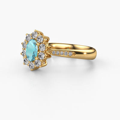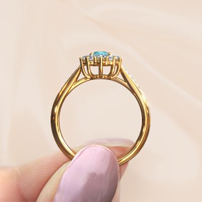 La bague de fiançailles présentée ci-dessus a été nommée Leesa 2. Nous appelons ce type de bague de fiançailles une bague entourage, dans laquelle de petites pierres précieuses sont serties autour de la pierre centrale dans un sertissage ouvert. Cette bague de fiançailles forgée en or 14 Carat a un topaze bleue ovale de 6x4 mm en guise de pierre centrale qui est aussi entourée de petits diamants. La particularité de cette bague de fiançailles classiques forgée en or jaune est sa forme : les petites pierres précieuses et le topaze bleue forment une belle fleur qui semble se fondre en une large pierre précieuse étincelante. Cette bague de fiançailles est aussi appelée la bague de fiançailles fleur ou rosette. Nos maîtres orfèvres veillent à ce que les plus petits diamants soient tous sertis de la même manière, afin que la lumière passant au travers du topaze bleue ne soit pas interrompue et qu'une belle unité soit créée. Avec un œil expérimenté et une main habile, chaque topaze bleue soigneusement sélectionné est serti dans la bague de fiançailles. Toujours et encore, la bague de fiançailles est examinée sous la lumière pour voir si l'effet spécial désiré est encore visible. Le résultat est une bague de fiançailles unique, où le topaze bleue choisi devient littéralement le centre brillants. Quelle bague de fiançailles belle et significative à offrir au centre qui brille dans votre vie ! Vous avez peut-être remarqué que nos prix sont en moyenne inférieurs de 30% à ceux d'un autre bijoutier. Et ce alors que la qualité de nos bijoux est même plus élevée dans la plupart des cas ! En effet, nos orfèvres fabriquent votre bague de fiançailles directement dans notre propre atelier. Cela signifie que nous n'avons pas à inclure des frais de stocks coûteux et que nous pouvons travailler n'importe quel détail directement sur votre bague de fiançailles.Notre équipe de designers talentueux et passionnés ajoute chaque jour de nouveaux modèles bague de fiançailles à notre collection en ligne. Notre objectif est de pouvoir vous offrir une grande variété de bijoux. N'hésitez pas à demander un devis si vous avez des souhaits spécifiques pour votre bague de fiançailles. Nous garantissons de vous faire une offre que vous ne pourrez pas refuser.Pour vous faciliter la tâche, vous pouvez facilement nous retourner tout bijou commandé dans les 30 jours suivant la livraison.