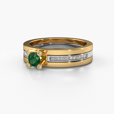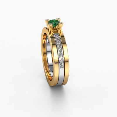 La bague de fiançailles mentionnée ci-dessus a été nommée Alisha. Ce type de bague de fiançailles est appelé une bague de fiançailles solitaire pavé car elle ne comporte qu’une seule pierre centrale et les tiges de la bague de fiançailles sont également pleins. La bague de fiançailles est faite dans une combinaison d'or 14 Carat et d’or blanc et a un emeraude ronds d’une de 4 mm, et des diamants sont sertis sur les épaules de l’anneau. Chaque bijou est unique car vous pouvez entièrement l'assembler à votre guise. Cette bague de fiançailles solitaire pavé forgée en or jaune design a un beau émeraudes ronds comme pierre centrale, avec plus de émeraudes sertis dans la bague pour accentuer encore plus la présence de la pierre centrale. Le sertissage à griffes autour du emeraude étant ouvert, le emeraude capte la lumière de tous les côtés et brille de manière optimale. Ci-dessus, vous pouvez voir comment notre orfèvre travaille la bague de fiançailles avec une extrême précision dans les moindres détails, de telle sorte que le emeraude élevé puisse attirer tous les regards. Quelle belle bague de fiançailles à offrir lors de votre demande en mariage à l'amour de votre vie, à votre centre rayonnant ! En combinant les dernières techniques modernes, associées à une fabrication ancienne, nous sommes en mesure de fabriquer nos bagues de fiançailles dans notre propre studio. Chaque bijou est fabriqué sur commande. Ceci est avantageux car nous sommes en mesure de vous proposer un prix que vous ne trouverez nulle part ailleurs.Avez-vous déjà des bague de fiançailles spécifiques en tête ? Une bague de fiançailles que vous avez vu quelque part. N'hésitez pas à nous faire part de vos souhaits et nous transformerons votre design en des bague de fiançailles uniques. Vous êtes en mesure de suivre l'évolution de la conception de vos bague de fiançailles car nous utilisons des dessins en 3D. Cela vous donnera un aperçu réaliste de votre design. Nous vous enverrons volontiers une offre sans engagement basée sur un rapport qualité / prix juste. Elle va vous étonner.Pour vous faciliter la tâche, vous pouvez facilement nous retourner tout bijou commandé dans les 30 jours suivant la livraison.