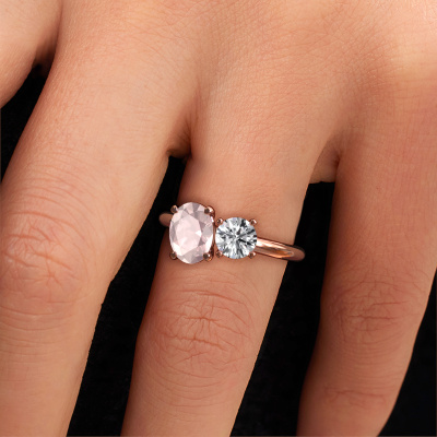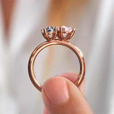 Nous appelons cette bague de fiançailles Toi et Moi OVL-RND. Cette bague forgée en or 14 Carat est sertie d’un champagne morganite. Vous recherchez une bague de fiançailles forgée en or rose unique et au look élégants ? Voici donc une belle