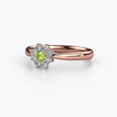 La bague de fiançailles présentée ci-dessus a été nommée Carolyn 1. Nous appelons ce type de bague de fiançailles une bague flower, dans laquelle de petites pierres précieuses sont serties autour de la pierre centrale dans un sertissage ouvert. Cette bague de fiançailles forgée en or 14 Carat a un péridot ronds de 3 mm en guise de pierre centrale qui est aussi entourée de petits diamants. La particularité de cette bague de fiançailles traditionnelles forgée en or rose est sa forme : les petites pierres précieuses et le péridot forment une belle fleur qui semble se fondre en une large pierre précieuse étincelante. Cette bague de fiançailles est aussi appelée la bague de fiançailles fleur ou rosette. Nos maîtres orfèvres veillent à ce que les plus petits diamants soient tous sertis de la même manière, afin que la lumière passant au travers du péridot ne soit pas interrompue et qu'une belle unité soit créée. Avec un œil expérimenté et une main habile, chaque péridot soigneusement sélectionné est serti dans la bague de fiançailles. Toujours et encore, la bague de fiançailles est examinée sous la lumière pour voir si l'effet spécial désiré est encore visible. Le résultat est une bague de fiançailles unique, où le péridot choisi devient littéralement le centre brillants. Quelle bague de fiançailles belle et significative à offrir au centre qui brille dans votre vie ! Qu'y a-t-il dorénavant de plus beau qu'une bague de fiançailles traditionnelles conçue par vous-même et fabriquée à la main par nous. Vous pouvez personnaliser chaque modèle avec les différents métaux précieux et pierres précieuses. De cette façon, vous pourrez créer une bague de fiançailles unique. Cette bague peut être mise en place de plusieurs façons. Bien sûr, vous pouvez toujours nous contacter et nous serons heureux de vous aider à composer votre bague de fiançailles traditionnelles Carolyn 1. Vous aimez le design, mais vous souhaitez tout de même quelque chose qui vous convienne plus, ou bien vous souhaitez une pierre précieuse dans les bijoux que vous ne pouvez pas choisir sur notre site, contactez-nous et nous vous aiderons.Avez-vous déjà des bague de fiançailles spécifiques en tête ? Une bague de fiançailles que vous avez vu quelque part. N'hésitez pas à nous faire part de vos souhaits et nous transformerons votre design en des bague de fiançailles uniques. Vous êtes en mesure de suivre l'évolution de la conception de vos bague de fiançailles car nous utilisons des dessins en 3D. Cela vous donnera un aperçu réaliste de votre design. Nous vous enverrons volontiers une offre sans engagement basée sur un rapport qualité / prix juste. Elle va vous étonner.Pour vous faciliter la tâche, vous pouvez facilement nous retourner tout bijou commandé dans les 30 jours suivant la livraison.