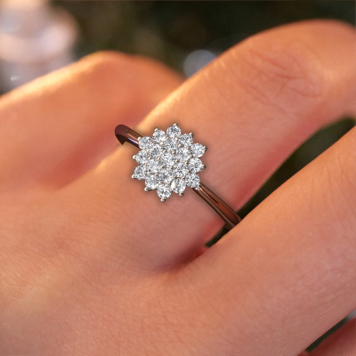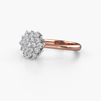 La bague de fiançailles présentée ci-dessus a été nommée Vickey. Nous appelons ce type de bague de fiançailles une bague entourage, dans laquelle de petites pierres précieuses sont serties autour de la pierre centrale dans un sertissage ouvert. Cette bague de fiançailles forgée en or 14 Carat a un diamant ronds de 0.025 crt en guise de pierre centrale qui est aussi entourée de petits diamants. La particularité de cette bague de fiançailles classiques forgée en or rose est sa forme : les petites pierres précieuses et le diamant forment une belle fleur qui semble se fondre en une large pierre précieuse étincelante. Cette bague de fiançailles est aussi appelée la bague de fiançailles fleur ou rosette. Nos maîtres orfèvres veillent à ce que les plus petits diamants soient tous sertis de la même manière, afin que la lumière passant au travers du diamant ne soit pas interrompue et qu'une belle unité soit créée. Avec un œil expérimenté et une main habile, chaque diamant soigneusement sélectionné est serti dans la bague de fiançailles. Toujours et encore, la bague de fiançailles est examinée sous la lumière pour voir si l'effet spécial désiré est encore visible. Le résultat est une bague de fiançailles unique, où le diamant choisi devient littéralement le centre brillants. Quelle bague de fiançailles belle et significative à offrir au centre qui brille dans votre vie ! Puisque nous concevons et livrons nos propres bijoux, nous sommes en mesure de vous proposer une bague de fiançailles à un prix que vous ne pourrez pas trouver ailleurs. Une alliance est fabriquée sur commande, ce qui permet d'éviter les excédents de matériel et nous permet de vous proposer une superbe offre de prix. Nous comprenons qu'acheter votre bague de fiançailles en ligne soit un risque, mais nous vous assistons volontiers dans le processus de conception, en tenant compte de votre budget.Notre équipe de designers talentueux et passionnés ajoute chaque jour de nouveaux modèles bague de fiançailles à notre collection en ligne. Notre objectif est de pouvoir vous offrir une grande variété de bijoux. N'hésitez pas à demander un devis si vous avez des souhaits spécifiques pour votre bague de fiançailles. Nous garantissons de vous faire une offre que vous ne pourrez pas refuser.Pour vous faciliter la tâche, vous pouvez facilement nous retourner tout bijou commandé dans les 30 jours suivant la livraison.