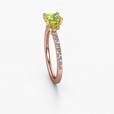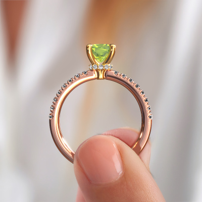 La bague de fiançailles mentionnée ci-dessus a été nommée Crystal CUS 4. Ce type de bague de fiançailles est appelé une bague de fiançailles solitaire pavé car elle ne comporte qu’une seule pierre centrale et les tiges de la bague de fiançailles sont également pleins. La bague de fiançailles est faite dans une combinaison d'or 14 Carat et d’or jaune et a un péridot coussin d’une de 5.5 mm, et des diamants sont sertis sur les épaules de l’anneau. Chaque bijou est faite pour briller sur votre doigt, chaque bijou est fabriqué à la main par nos orfèvres. Cette bague de fiançailles solitaire pavé forgée en or rose élégants a un beau péridots coussin comme pierre centrale, avec plus de péridots sertis dans la bague pour accentuer encore plus la présence de la pierre centrale. Le sertissage à griffes autour du péridot étant ouvert, le péridot capte la lumière de tous les côtés et brille de manière optimale. Ci-dessus, vous pouvez voir comment notre orfèvre travaille la bague de fiançailles avec une extrême précision dans les moindres détails, de telle sorte que le péridot élevé puisse attirer tous les regards. Quelle belle bague de fiançailles à offrir lors de votre demande en mariage à l'amour de votre vie, à votre centre rayonnant ! Qu'y a-t-il dorénavant de plus beau qu'une bague de fiançailles élégants conçue par vous-même et fabriquée à la main par nous. Vous pouvez personnaliser chaque modèle avec les différents métaux précieux et pierres précieuses. De cette façon, vous pourrez créer une bague de fiançailles unique. Cette bague peut être mise en place de plusieurs façons. Bien sûr, vous pouvez toujours nous contacter et nous serons heureux de vous aider à composer votre bague de fiançailles élégants Crystal CUS 4. Vous aimez le design, mais vous souhaitez tout de même quelque chose qui vous convienne plus, ou bien vous souhaitez une pierre précieuse dans les bijoux que vous ne pouvez pas choisir sur notre site, contactez-nous et nous vous aiderons.Avez-vous déjà des bague de fiançailles spécifiques en tête ? Une bague de fiançailles que vous avez vu quelque part. N'hésitez pas à nous faire part de vos souhaits et nous transformerons votre design en des bague de fiançailles uniques. Vous êtes en mesure de suivre l'évolution de la conception de vos bague de fiançailles car nous utilisons des dessins en 3D. Cela vous donnera un aperçu réaliste de votre design. Nous vous enverrons volontiers une offre sans engagement basée sur un rapport qualité / prix juste. Elle va vous étonner.Pour vous faciliter la tâche, vous pouvez facilement nous retourner tout bijou commandé dans les 30 jours suivant la livraison.