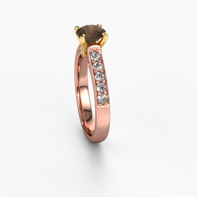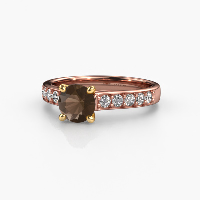 La bague de fiançailles mentionnée ci-dessus a été nommée Valorie RND 2. Ce type de bague de fiançailles est appelé une bague de fiançailles solitaire pavé car elle ne comporte qu’une seule pierre centrale et les tiges de la bague de fiançailles sont également pleins. La bague de fiançailles est faite dans une combinaison d'or 14 Carat et d’or jaune et a un quartz fumé ronds d’une de 6.5 mm, et des diamants synthétiques sont sertis sur les épaules de l’anneau. Chaque bijou est faite spécialement pour vous, avec une attention particulière portée aux détails et au design. Cette bague de fiançailles solitaire pavé forgée en or rose modernes a un beau quartz fumé ronds comme pierre centrale, avec plus de quartz fumé sertis dans la bague pour accentuer encore plus la présence de la pierre centrale. Le sertissage à griffes autour du quartz fumé étant ouvert, le quartz fumé capte la lumière de tous les côtés et brille de manière optimale. Ci-dessus, vous pouvez voir comment notre orfèvre travaille la bague de fiançailles avec une extrême précision dans les moindres détails, de telle sorte que le quartz fumé élevé puisse attirer tous les regards. Quelle belle bague de fiançailles à offrir lors de votre demande en mariage à l'amour de votre vie, à votre centre rayonnant ! Qu'y a-t-il dorénavant de plus beau qu'une bague de fiançailles modernes conçue par vous-même et fabriquée à la main par nous. Vous pouvez personnaliser chaque modèle avec les différents métaux précieux et pierres précieuses. De cette façon, vous pourrez créer une bague de fiançailles unique. Cette bague peut être mise en place de plusieurs façons. Bien sûr, vous pouvez toujours nous contacter et nous serons heureux de vous aider à composer votre bague de fiançailles modernes Valorie RND 2. Vous aimez le design, mais vous souhaitez tout de même quelque chose qui vous convienne plus, ou bien vous souhaitez une pierre précieuse dans les bijoux que vous ne pouvez pas choisir sur notre site, contactez-nous et nous vous aiderons.Notre équipe de designers talentueux et passionnés ajoute chaque jour de nouveaux modèles bague de fiançailles à notre collection en ligne. Notre objectif est de pouvoir vous offrir une grande variété de bijoux. N'hésitez pas à demander un devis si vous avez des souhaits spécifiques pour votre bague de fiançailles. Nous garantissons de vous faire une offre que vous ne pourrez pas refuser.Pour vous faciliter la tâche, vous pouvez facilement nous retourner tout bijou commandé dans les 30 jours suivant la livraison.