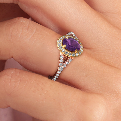 La bague de fiançailles mentionnée ci-dessus est nommée Pamela OVL. Nous appelons ce type de bague de fiançailles une bague Halo. La bague de fiançailles est forgée en or 14 Carat et comporte un améthyste ovale de la de 7x5 mm et autour duquel sont sertis de petits diamants synthétiques. La largeur de cette bague de fiançailles halo forgée en or rose luxes vient des plus petites pierres précieuses qui sont serties autour du large améthyste central. C’est également ce à partir de quoi cette belle bague de fiançailles tire son nom : halo signifie halo et c’est aussi l’effet que rendent les pierres précieuses plus petites. Cependant, ces pierres précieuses plus petites doivent toutes être serties de la même manière, afin que la lumière ne soit pas seulement introduite dans le améthyste et qu’un véritable halo de lumière soit créé. Et c'est ce que font nos maîtres orfèvres. Avec la plus grande précision, chaque améthyste soigneusement sélectionné est placé à la main dans la bague de fiançailles. Encore et encore, la bague de fiançailles est maintenue à la lumière pour voir si l'effet spécial est toujours visible. Le résultat est une bague de fiançailles unique, où le améthyste choisi devient littéralement le centre brillants. Vous pouvez imaginer que cette bague de fiançailles est vraiment une bague de fiançailles significative à offrir à votre amour de la vie ! Le jour où vous montrez qu’elle est votre centre brillants ! Qu'y a-t-il dorénavant de plus beau qu'une bague de fiançailles luxes conçue par vous-même et fabriquée à la main par nous. Vous pouvez personnaliser chaque modèle avec les différents métaux précieux et pierres précieuses. De cette façon, vous pourrez créer une bague de fiançailles unique. Cette bague peut être mise en place de plusieurs façons. Bien sûr, vous pouvez toujours nous contacter et nous serons heureux de vous aider à composer votre bague de fiançailles luxes Pamela OVL. Vous aimez le design, mais vous souhaitez tout de même quelque chose qui vous convienne plus, ou bien vous souhaitez une pierre précieuse dans les bijoux que vous ne pouvez pas choisir sur notre site, contactez-nous et nous vous aiderons.Notre équipe ajoute quotidiennement de nouveaux modèles à notre collection en ligne. Nos designers et orfèvres travaillent ensemble pour créer le meilleur design. Nous nous efforçons d'offrir une collection diversifiée de bijoux. Peut-être avez-vous déjà en tête un bijou en particulier ? Un bijou que vous avez trouvé quelque part. Veuillez nous contacter pour une consultation gratuite. Nous vous ferons une offre, basée sur un rapport qualité / prix juste, qui vous déconcertera.Pour vous faciliter la tâche, vous pouvez facilement nous retourner tout bijou commandé dans les 30 jours suivant la livraison.