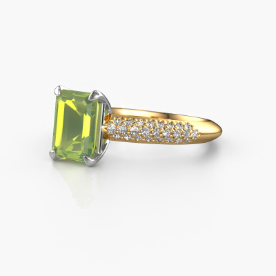 La bague de fiançailles mentionnée ci-dessus a été nommée Morane EME. Ce type de bague de fiançailles est appelé une bague de fiançailles solitaire pavé car elle ne comporte qu’une seule pierre centrale et les tiges de la bague de fiançailles sont également pleins. La bague de fiançailles est faite dans une combinaison d'or 14 Carat et d’or blanc et a un péridot taille émeraude d’une de 8x6 mm, et des diamants synthétiques sont sertis sur les épaules de l’anneau. Chaque bijou est fabriquée spécialement pour vous par nos maîtres orfèvres dans notre propre atelier. Cette bague de fiançailles solitaire pavé forgée en or jaune uniques a un beau péridots taille émeraude comme pierre centrale, avec plus de péridots sertis dans la bague pour accentuer encore plus la présence de la pierre centrale. Le sertissage à griffes autour du péridot étant ouvert, le péridot capte la lumière de tous les côtés et brille de manière optimale. Ci-dessus, vous pouvez voir comment notre orfèvre travaille la bague de fiançailles avec une extrême précision dans les moindres détails, de telle sorte que le péridot élevé puisse attirer tous les regards. Quelle belle bague de fiançailles à offrir lors de votre demande en mariage à l'amour de votre vie, à votre centre rayonnant ! Saviez-vous que nous offrons la garantie du meilleur prix pour votre bague de fiançailles? Cela est possible car tous nos bijoux sont fabriqués à la main dans notre propre atelier. Nous n'avons pas de frais de stocks qui sont coûteux, et nous fabriquons votre bague uniquement une fois que vous l'avez commandée. Grâce au fait que nous ayons toute la production du bijou en main, nous pouvons vous informer sur toutes les caractéristiques de cette bague de fiançailles. C’est précisément parce que l’achat d’une bague en ligne est une expérience excitante que nous comprenons qu’il est plus confortable pour vous de connaître toutes les caractéristiques de votre bague.Notre équipe ajoute quotidiennement de nouveaux modèles à notre collection en ligne. Nos designers et orfèvres travaillent ensemble pour créer le meilleur design. Nous nous efforçons d'offrir une collection diversifiée de bijoux. Peut-être avez-vous déjà en tête un bijou en particulier ? Un bijou que vous avez trouvé quelque part. Veuillez nous contacter pour une consultation gratuite. Nous vous ferons une offre, basée sur un rapport qualité / prix juste, qui vous déconcertera.Pour vous faciliter la tâche, vous pouvez facilement nous retourner tout bijou commandé dans les 30 jours suivant la livraison.