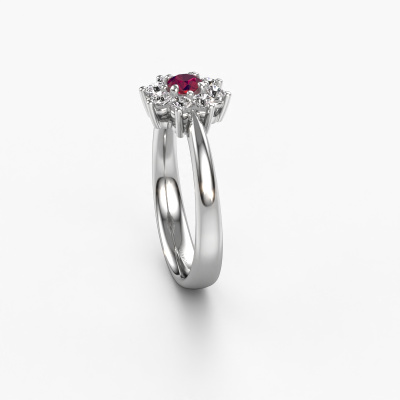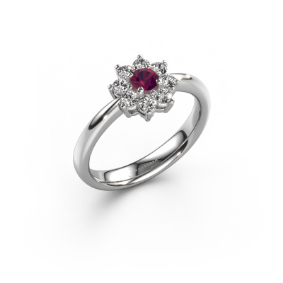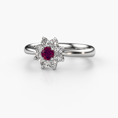 La bague de fiançailles présentée ci-dessus a été nommée Camille 1. Nous appelons ce type de bague de fiançailles une bague flower, dans laquelle de petites pierres précieuses sont serties autour de la pierre centrale dans un sertissage ouvert. Cette bague de fiançailles forgée en or a un rhodolite ronds de 3.4 mm en guise de pierre centrale qui est aussi entourée de petits diamants. La particularité de cette bague de fiançailles traditionnelles forgée en platine est sa forme : les petites pierres précieuses et le rhodolite forment une belle fleur qui semble se fondre en une large pierre précieuse étincelante. Cette bague de fiançailles est aussi appelée la bague de fiançailles fleur ou rosette. Nos maîtres orfèvres veillent à ce que les plus petits diamants soient tous sertis de la même manière, afin que la lumière passant au travers du rhodolite ne soit pas interrompue et qu'une belle unité soit créée. Avec un œil expérimenté et une main habile, chaque rhodolite soigneusement sélectionné est serti dans la bague de fiançailles. Toujours et encore, la bague de fiançailles est examinée sous la lumière pour voir si l'effet spécial désiré est encore visible. Le résultat est une bague de fiançailles unique, où le rhodolite choisi devient littéralement le centre brillants. Quelle bague de fiançailles belle et significative à offrir au centre qui brille dans votre vie ! Qu'y a-t-il dorénavant de plus beau qu'une bague de fiançailles traditionnelles conçue par vous-même et fabriquée à la main par nous. Vous pouvez personnaliser chaque modèle avec les différents métaux précieux et pierres précieuses. De cette façon, vous pourrez créer une bague de fiançailles unique. Cette bague peut être mise en place de plusieurs façons. Bien sûr, vous pouvez toujours nous contacter et nous serons heureux de vous aider à composer votre bague de fiançailles traditionnelles Camille 1. Vous aimez le design, mais vous souhaitez tout de même quelque chose qui vous convienne plus, ou bien vous souhaitez une pierre précieuse dans les bijoux que vous ne pouvez pas choisir sur notre site, contactez-nous et nous vous aiderons.Notre équipe ajoute quotidiennement de nouveaux modèles à notre collection en ligne. Nos designers et orfèvres travaillent ensemble pour créer le meilleur design. Nous nous efforçons d'offrir une collection diversifiée de bijoux. Peut-être avez-vous déjà en tête un bijou en particulier ? Un bijou que vous avez trouvé quelque part. Veuillez nous contacter pour une consultation gratuite. Nous vous ferons une offre, basée sur un rapport qualité / prix juste, qui vous déconcertera.Pour vous faciliter la tâche, vous pouvez facilement nous retourner tout bijou commandé dans les 30 jours suivant la livraison.