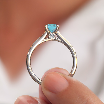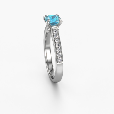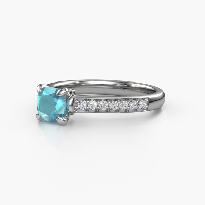 La bague de fiançailles mentionnée ci-dessus a été nommée Valorie cus 2. Ce type de bague de fiançailles est appelé une bague de fiançailles solitaire pavé car elle ne comporte qu’une seule pierre centrale et les tiges de la bague de fiançailles sont également pleins. La bague de fiançailles est faite dans une combinaison d'or et d’platine et a un topaze bleue coussin d’une de 5.5 mm, et des diamants sont sertis sur les épaules de l’anneau. Chaque bijou est fabriquées spécialement pour vous par nos maîtres orfèvres dans notre propre atelier. Cette bague de fiançailles solitaire pavé forgée en platine traditionnelles a un beau topaze bleue coussin comme pierre centrale, avec plus de topaze bleue sertis dans la bague pour accentuer encore plus la présence de la pierre centrale. Le sertissage à griffes autour du topaze bleue étant ouvert, le topaze bleue capte la lumière de tous les côtés et brille de manière optimale. Ci-dessus, vous pouvez voir comment notre orfèvre travaille la bague de fiançailles avec une extrême précision dans les moindres détails, de telle sorte que le topaze bleue élevé puisse attirer tous les regards. Quelle belle bague de fiançailles à offrir lors de votre demande en mariage à l'amour de votre vie, à votre centre rayonnant ! En combinant les dernières techniques modernes, associées à une fabrication ancienne, nous sommes en mesure de fabriquer nos bagues de fiançailles dans notre propre studio. Chaque bijou est fabriqué sur commande. Ceci est avantageux car nous sommes en mesure de vous proposer un prix que vous ne trouverez nulle part ailleurs.Notre équipe de designers talentueux et passionnés ajoute chaque jour de nouveaux modèles bague de fiançailles à notre collection en ligne. Notre objectif est de pouvoir vous offrir une grande variété de bijoux. N'hésitez pas à demander un devis si vous avez des souhaits spécifiques pour votre bague de fiançailles. Nous garantissons de vous faire une offre que vous ne pourrez pas refuser.Pour vous faciliter la tâche, vous pouvez facilement nous retourner tout bijou commandé dans les 30 jours suivant la livraison.