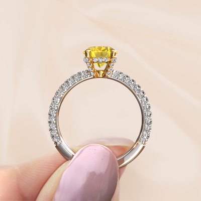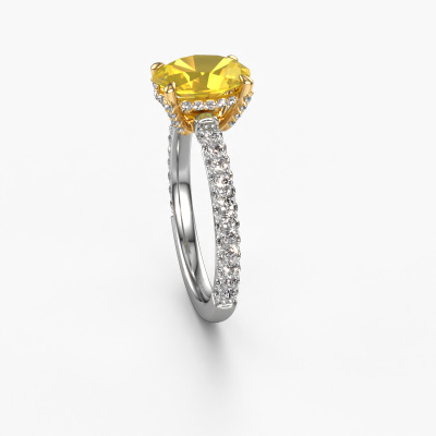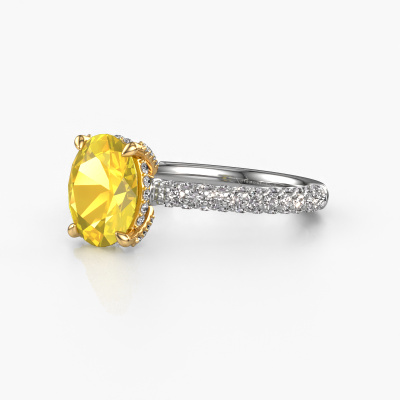 La bague de fiançailles mentionnée ci-dessus a été nommée Saskia 2 ovl. Ce type de bague de fiançailles est appelé une bague de fiançailles solitaire pavé car elle ne comporte qu’une seule pierre centrale et les tiges de la bague de fiançailles sont également pleins. La bague de fiançailles est faite dans une combinaison d'or 14 Carat et d’or jaune et a un saphir jaune ovale d’une de 9x7 mm, et des diamants synthétiques sont sertis sur les épaules de l’anneau. Chaque bijou est fabriquée spécialement pour vous par nos maîtres orfèvres dans notre propre atelier. Cette bague de fiançailles solitaire pavé forgée en or blanc exclusives a un beau saphirs jaunes ovale comme pierre centrale, avec plus de saphirs jaunes sertis dans la bague pour accentuer encore plus la présence de la pierre centrale. Le sertissage à griffes autour du saphir jaune étant ouvert, le saphir jaune capte la lumière de tous les côtés et brille de manière optimale. Ci-dessus, vous pouvez voir comment notre orfèvre travaille la bague de fiançailles avec une extrême précision dans les moindres détails, de telle sorte que le saphir jaune élevé puisse attirer tous les regards. Quelle belle bague de fiançailles à offrir lors de votre demande en mariage à l'amour de votre vie, à votre centre rayonnant ! Saviez-vous que nous offrons la garantie du meilleur prix pour votre bague de fiançailles? Cela est possible car tous nos bijoux sont fabriqués à la main dans notre propre atelier. Nous n'avons pas de frais de stocks qui sont coûteux, et nous fabriquons votre bague uniquement une fois que vous l'avez commandée. Grâce au fait que nous ayons toute la production du bijou en main, nous pouvons vous informer sur toutes les caractéristiques de cette bague de fiançailles. C’est précisément parce que l’achat d’une bague en ligne est une expérience excitante que nous comprenons qu’il est plus confortable pour vous de connaître toutes les caractéristiques de votre bague.Avez-vous déjà des bague de fiançailles spécifiques en tête ? Une bague de fiançailles que vous avez vu quelque part. N'hésitez pas à nous faire part de vos souhaits et nous transformerons votre design en des bague de fiançailles uniques. Vous êtes en mesure de suivre l'évolution de la conception de vos bague de fiançailles car nous utilisons des dessins en 3D. Cela vous donnera un aperçu réaliste de votre design. Nous vous enverrons volontiers une offre sans engagement basée sur un rapport qualité / prix juste. Elle va vous étonner.Pour vous faciliter la tâche, vous pouvez facilement nous retourner tout bijou commandé dans les 30 jours suivant la livraison.