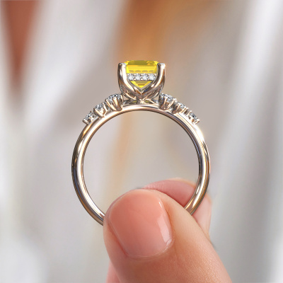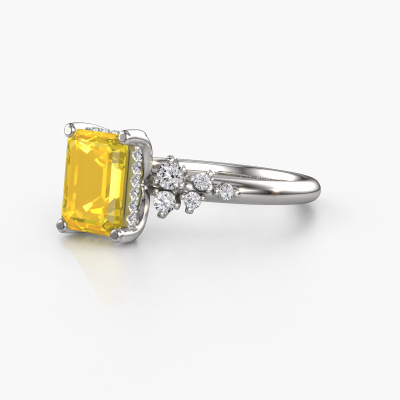Nous avons donné le nom Emma EME à la bague de fiançailles mentionnée ci-dessous. Ce type de bague de fiançailles est appelé une bague de fiançailles solitaire pavé car elle ne comporte qu’une seule pierre centrale et les tiges de la bague de fiançailles ont également une finition pleine. Cette bague de fiançailles est forgée en or 14 Carat et comporte un saphir jaune taille émeraude de 8x6 mm. Des diamants synthétiques sont sertis dans les épaules latérales de l’anneau. Chaque bijou est faite avec passion et amour par l'un de nos maîtres orfèvres.. Cette bague de fiançailles solitaire pavé forgée en or blanc fantaisie a un beau saphir jaune taille émeraude en guise de pierre centrale, avec plus de diamants synthétiques dans l’anneau pour accentuer encore plus l’effet de la pierre centrale. Le sertissage à griffes autour du saphir jaune étant ouvert, le saphir jaune capte la lumière de tous les côtés et brille de manière optimale. Ci-dessus, vous pouvez voir comment notre orfèvre a travaillé la bague de fiançailles dans les moindres détails. de telle sorte que le saphir jaune élevé puisse véritablement attirer tous les regards. Quelle belle bague de fiançailles à offre lors de votre demande en mariage à l'amour de votre vie, à votre centre rayonnant ! Saviez-vous que nous offrons la garantie du meilleur prix pour votre bague de fiançailles? Cela est possible car tous nos bijoux sont fabriqués à la main dans notre propre atelier. Nous n'avons pas de frais de stocks qui sont coûteux, et nous fabriquons votre bague uniquement une fois que vous l'avez commandée. Grâce au fait que nous ayons toute la production du bijou en main, nous pouvons vous informer sur toutes les caractéristiques de cette bague de fiançailles. C’est précisément parce que l’achat d’une bague en ligne est une expérience excitante que nous comprenons qu’il est plus confortable pour vous de connaître toutes les caractéristiques de votre bague.Notre équipe ajoute quotidiennement de nouveaux modèles à notre collection en ligne. Nos designers et orfèvres travaillent ensemble pour créer le meilleur design. Nous nous efforçons d'offrir une collection diversifiée de bijoux. Peut-être avez-vous déjà en tête un bijou en particulier ? Un bijou que vous avez trouvé quelque part. Veuillez nous contacter pour une consultation gratuite. Nous vous ferons une offre, basée sur un rapport qualité / prix juste, qui vous déconcertera.Pour vous faciliter la tâche, vous pouvez facilement nous retourner tout bijou commandé dans les 30 jours suivant la livraison.