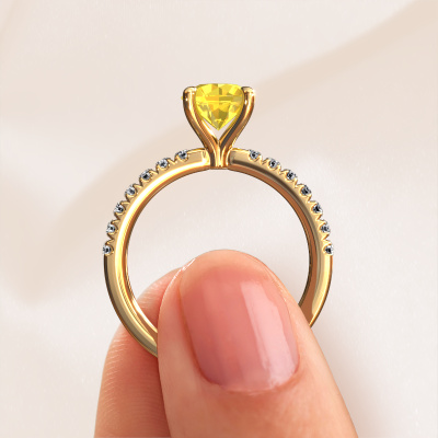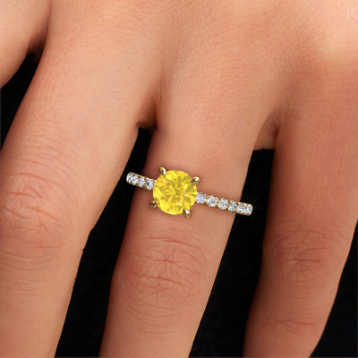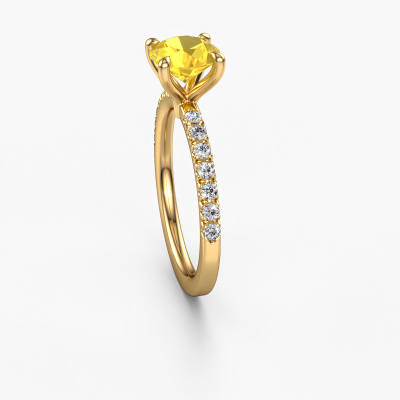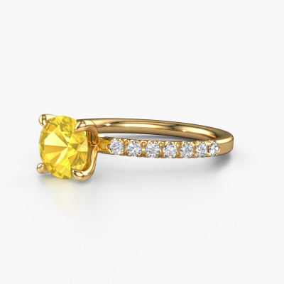 La bague de fiançailles mentionnée ci-dessus a été nommée Crystal RND 2. Ce type de bague de fiançailles est appelé une bague de fiançailles solitaire pavé car elle ne comporte qu’une seule pierre centrale et les tiges de la bague de fiançailles sont également pleins. La bague de fiançailles est faite dans une combinaison d'or 14 Carat et d’or jaune et a un saphir jaune ronds d’une de 7 mm, et des diamants synthétiques sont sertis sur les épaules de l’anneau. Chaque bijou est unique car vous pouvez entièrement l'assembler à votre guise. Cette bague de fiançailles solitaire pavé forgée en or jaune classiques a un beau saphirs jaunes ronds comme pierre centrale, avec plus de saphirs jaunes sertis dans la bague pour accentuer encore plus la présence de la pierre centrale. Le sertissage à griffes autour du saphir jaune étant ouvert, le saphir jaune capte la lumière de tous les côtés et brille de manière optimale. Ci-dessus, vous pouvez voir comment notre orfèvre travaille la bague de fiançailles avec une extrême précision dans les moindres détails, de telle sorte que le saphir jaune élevé puisse attirer tous les regards. Quelle belle bague de fiançailles à offrir lors de votre demande en mariage à l'amour de votre vie, à votre centre rayonnant ! Nos orfèvres ne fabriqueront votre bague de fiançailles qu'une fois que vous l'aurez commandée. Nous ne faisons pas de stock. L'avantage de cela est que nous n'avons pas à inclure les frais de stockage dans nos prix, et nous pouvons donc vous offrir des bijoux à un prix très bas.Notre équipe ajoute quotidiennement de nouveaux modèles à notre collection en ligne. Nos designers et orfèvres travaillent ensemble pour créer le meilleur design. Nous nous efforçons d'offrir une collection diversifiée de bijoux. Peut-être avez-vous déjà en tête un bijou en particulier ? Un bijou que vous avez trouvé quelque part. Veuillez nous contacter pour une consultation gratuite. Nous vous ferons une offre, basée sur un rapport qualité / prix juste, qui vous déconcertera.Pour vous faciliter la tâche, vous pouvez facilement nous retourner tout bijou commandé dans les 30 jours suivant la livraison.
