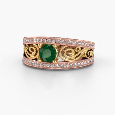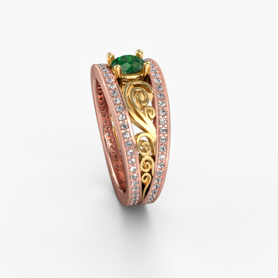 Cette bague de fiançailles filigranes porte le nom Julliana. Cette bague forgée en or 14 Carat est sertie d’un emeraude de 5 mm. Il y a une personne dans votre vie qui quand elle se présente devant vous, votre cœur bat plus vite, ce qui est vraiment unique pour vous. Et c’est précisément cette personne qui mérite quelque chose de spécial, quelque chose d’unique et qui a été conçu spécialement pour elle. Nous soupçonnons que cette bague de fiançailles s'intègre bien dans cette situation. Tous les détails de cette bague de fiançailles unique forgée en or rose sont composés, travaillés et polis à la main par notre orfèvre dans l'atelier ci-dessous. Notre objectif est que la conception et la composition de la bague de fiançailles renforcent et rayonnent les beaux émeraudes. Un travail très précis, qui donne finalement à un résultat magnifique. Et c’est exactement ce que nous voulons, cela nous rend très enthousiastes. L’avantage de notre outil de configuration est que vous pouvez concevoir entièrement vos propres bijoux pour créer votre propre bijou. Cette bague de fiançailles solitaire pavé est faite à partir de la combinaison de métaux précieux : de l’or avec de l’or jaune, mais vous pouvez également choisir une autre couleur d’or. Chaque bijou est fabriquées spécialement pour vous par nos maîtres orfèvres dans notre propre atelier.Qu'y a-t-il dorénavant de plus beau qu'une bague de fiançailles vintage conçue par vous-même et fabriquée à la main par nous. Vous pouvez personnaliser chaque modèle avec les différents métaux précieux et pierres précieuses. De cette façon, vous pourrez créer une bague de fiançailles unique. Cette bague peut être mise en place de plusieurs façons. Bien sûr, vous pouvez toujours nous contacter et nous serons heureux de vous aider à composer votre bague de fiançailles vintage Julliana. Vous aimez le design, mais vous souhaitez tout de même quelque chose qui vous convienne plus, ou bien vous souhaitez une pierre précieuse dans les bijoux que vous ne pouvez pas choisir sur notre site, contactez-nous et nous vous aiderons.Notre équipe ajoute quotidiennement de nouveaux modèles à notre collection en ligne. Nos designers et orfèvres travaillent ensemble pour créer le meilleur design. Nous nous efforçons d'offrir une collection diversifiée de bijoux. Peut-être avez-vous déjà en tête un bijou en particulier ? Un bijou que vous avez trouvé quelque part. Veuillez nous contacter pour une consultation gratuite. Nous vous ferons une offre, basée sur un rapport qualité / prix juste, qui vous déconcertera.Pour vous faciliter la tâche, vous pouvez facilement nous retourner tout bijou commandé dans les 30 jours suivant la livraison.
