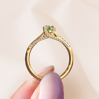Cette bague de fiançailles porte le nom Mia 3. Cette bague de fiançailles brillantes est forgée en or 14 Carat et est sertie d’un diamants synthétiques vert de 5 mm. Cette bague de fiançailles solitaire pavé et forgée en or jaune unique est un pur travail d’art ! Tous les petits détails ont été fabriqués avec beaucoup de patience et de passion par notre orfèvre. Ce métier nécessite un œil expert et une main habile pour assembler cette bague de fiançailles avec la plus grande précision. Et ce travail est précisément ce qui enthousiasme nos orfèvres ! Les plus beaux diamants synthétiques vert sont sertis de manière large, de telle sorte qu'ils puissent rendre un effet encore meilleurs. Cela donne donc une allure supplémentaire à la bague de fiançailles. La bague de fiançailles est unique en raison de sa pierre précieuse naturelle, que nous avons spécialement sélectionnée pour cette bague. De plus, vous pouvez choisir vous-même la composition du métal précieux de votre bague. Vous aurez donc créé une bague de fiançailles unique pour la femmes la plus unique de votre vie ! Ce bijou est unique, car vous pouvez concevoir ces bagues en fonction de vos souhaits.Vous avez peut-être remarqué que nos prix sont en moyenne inférieurs de 30% à ceux d'un autre bijoutier. Et ce alors que la qualité de nos bijoux est même plus élevée dans la plupart des cas ! En effet, nos orfèvres fabriquent votre bague de fiançailles directement dans notre propre atelier. Cela signifie que nous n'avons pas à inclure des frais de stocks coûteux et que nous pouvons travailler n'importe quel détail directement sur votre bague de fiançailles.Notre équipe ajoute quotidiennement de nouveaux modèles à notre collection en ligne. Nos designers et orfèvres travaillent ensemble pour créer le meilleur design. Nous nous efforçons d'offrir une collection diversifiée de bijoux. Peut-être avez-vous déjà en tête un bijou en particulier ? Un bijou que vous avez trouvé quelque part. Veuillez nous contacter pour une consultation gratuite. Nous vous ferons une offre, basée sur un rapport qualité / prix juste, qui vous déconcertera.Pour vous faciliter la tâche, vous pouvez facilement nous retourner tout bijou commandé dans les 30 jours suivant la livraison.