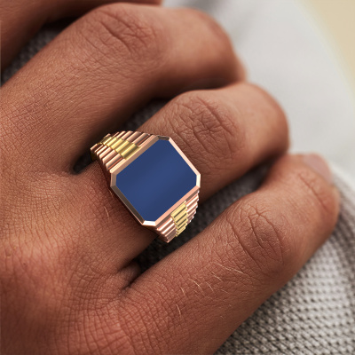 Tout le monde connaît le design de cette marque horlogère bien connue. Avec ses maillons de deux couleurs d’or, cette plate bague Brent 2 forgée en or rose 14 Carat, convient à l’homme exclusives et accompli. Un homme qui veut faire une déclaration avec une chevalière frappante sertie d’un lapis lazuli de 12x10 mm. Montrez qui vous êtes ! Votre chevalière personnelle spéciales Brent 2 que vous vous créez est fabriquée avec amour et passion par nos orfèvres. Préféreriez-vous une option autre que la chevalière en or rose présentée ici ? Vous avez alors diverses options possibles via le configurateur. Si vous n'êtes pas complètement sûr(e), nous serons ravis de vous conseiller !