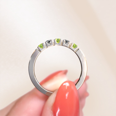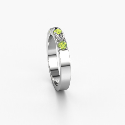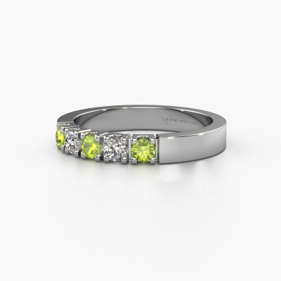 Cette bague style 5 pierres porte le nom de Dana 5. Ce type de bague s'appelle «Mémoire», car elle est créée avec un profil droit. Cela permet de porter la bague à côté d'autres bagues. Cette bague est en platine et contient un péridot associé à une diamant de 3 mm serties sur l'anneau. Comme vous pouvez le constater, avec cette belle mémoire pour femmes en platine, de péridots sont sertis les uns à côté des autres sur la bague. Le sens de l'mémoire est littéralement de 'travailler ensemble'. Et c’est exactement ce que font ces pierres précieuses : ensemble, elles créent un effet spécial supplémentaire sur l'anneau avec un anneau modernes ! Une belle symbolique pour un anneau, non ? Tous les péridots soigneusement sélectionnés sont placés à la main par notre maître orfèvre. Un travail très précis, qui tire le meilleur parti de notre combinaison unique d'artisanat pur et des techniques d'orfèvre les plus modernes. Toutes les pierres précieuses doivent être serties exactement de la même manière pour diffuser parfaitement la lumière. Par conséquent, l'orfèvre gardera cette bague sous la lumière pour voir si les péridots sont placés correctement. Cela demande une main habile et beaucoup de patience, mais le résultat est un véritable chef-d'œuvre. Et c'est ce que nous recherchons ! Puisque nous concevons et livrons nos propres bijoux, nous sommes en mesure de vous proposer une bague à un prix que vous ne pourrez pas trouver ailleurs. Une alliance est fabriquée sur commande, ce qui permet d'éviter les excédents de matériel et nous permet de vous proposer une superbe offre de prix. Nous comprenons qu'acheter votre bague en ligne soit un risque, mais nous vous assistons volontiers dans le processus de conception, en tenant compte de votre budget. De nouveaux modèles de bijoux sont ajoutés à notre collection en ligne quotidiennement. Notre équipe de designers passionnés s'efforce de créer des designs extraordinaires et variés. Avez-vous vu une bague qui vous plait ? N'hésitez pas à nous contacter. Grâce à un bon rapport qualité / prix, nous vous ferons une offre que vous ne pourrez pas refuser ! Pour vous faciliter la tâche, vous pouvez facilement nous retourner tout bijou commandé dans les 30 jours suivant la livraison.'