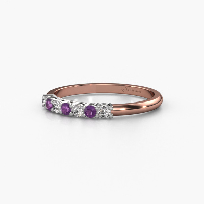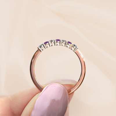 Cette bague style 7 pierres porte le nom de Michelle 7. Ce type de bague s'appelle «Mémoire», car elle est créée avec un profil droit. Cela permet de porter la bague à côté d'autres bagues. Cette bague est en or rose 14 Carat et contient un améthyste associé à une diamant de 2 mm serties sur l'anneau. Comme vous pouvez le constater, avec cette belle mémoire pour femmes en or rose, de améthystes sont sertis les uns à côté des autres sur la bague. Le sens de l'mémoire est littéralement de 'travailler ensemble'. Et c’est exactement ce que font ces pierres précieuses : ensemble, elles créent un effet spécial supplémentaire sur l'anneau avec un anneau classiques ! Une belle symbolique pour un anneau, non ? Tous les améthystes soigneusement sélectionnés sont placés à la main par notre maître orfèvre. Un travail très précis, qui tire le meilleur parti de notre combinaison unique d'artisanat pur et des techniques d'orfèvre les plus modernes. Toutes les pierres précieuses doivent être serties exactement de la même manière pour diffuser parfaitement la lumière. Par conséquent, l'orfèvre gardera cette bague sous la lumière pour voir si les améthystes sont placés correctement. Cela demande une main habile et beaucoup de patience, mais le résultat est un véritable chef-d'œuvre. Et c'est ce que nous recherchons ! En combinant les dernières techniques modernes, associées à une fabrication ancienne, nous sommes en mesure de fabriquer nos bagues dans notre propre studio. Chaque bijou est fabriqué sur commande. Ceci est avantageux car nous sommes en mesure de vous proposer un prix que vous ne trouverez nulle part ailleurs.