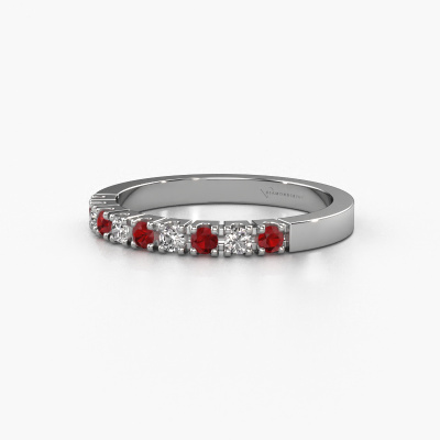 Cette bague style 9 pierres porte le nom de Dana 9. Ce type de bague s'appelle «Mémoire», car elle est créée avec un profil droit. Cela permet de porter la bague à côté d'autres bagues. Cette bague est en or blanc 14 Carat et contient un rubis associé à une diamant de 2 mm serties sur l'anneau. Comme vous pouvez le constater, avec cette belle mémoire pour femmes en or blanc, de rubis sont sertis les uns à côté des autres sur la bague. Le sens de l'mémoire est littéralement de 'travailler ensemble'. Et c’est exactement ce que font ces pierres précieuses : ensemble, elles créent un effet spécial supplémentaire sur l'anneau avec un anneau modernes ! Une belle symbolique pour un anneau, non ? Tous les rubis soigneusement sélectionnés sont placés à la main par notre maître orfèvre. Un travail très précis, qui tire le meilleur parti de notre combinaison unique d'artisanat pur et des techniques d'orfèvre les plus modernes. Toutes les pierres précieuses doivent être serties exactement de la même manière pour diffuser parfaitement la lumière. Par conséquent, l'orfèvre gardera cette bague sous la lumière pour voir si les rubis sont placés correctement. Cela demande une main habile et beaucoup de patience, mais le résultat est un véritable chef-d'œuvre. Et c'est ce que nous recherchons ! En combinant les dernières techniques modernes, associées à une fabrication ancienne, nous sommes en mesure de fabriquer nos bagues dans notre propre studio. Chaque bijou est fabriqué sur commande. Ceci est avantageux car nous sommes en mesure de vous proposer un prix que vous ne trouverez nulle part ailleurs. Nos designers talentueux ajoutent quotidiennement de nouveaux modèles à notre collection en ligne. Ensemble, ils créent une collection variée des plus beaux bijoux. Si vous préférez créer des bagues selon votre propre conception, n'hésitez pas à demander un devis. Nous vous ferons une offre incroyable, basée sur la qualité et le prix. Pour vous faciliter la tâche, vous pouvez facilement nous retourner tout bijou commandé dans les 30 jours suivant la livraison.'