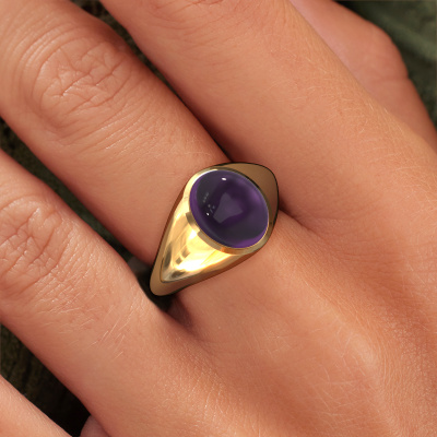 Sur la photo, vous pouvez voir la bague forgée en or jaune Zaza avec un cabochon améthyste. Cabochon signifie que le améthyste est d'abord affûté en une forme spécifique, telle que la forme d'une goutte, d'un cœur ou une forme cabochon ovale. Puis que des couches sont coupées du haut de la pierre jusqu'à ce que la pierre ait une belle forme convexe. Un bijou avec une pierre précieuse taillée en cabochon est magnifique, attire élégamment tous les regards et correspond parfaitement à un style design et plus encore à un style vintage. Votre bague 1 pierre est finalisée dans les moindres détails par nos orfèvres jusqu'à la création de votre bague unique, dans laquelle le améthyste cabochon prend tout son sens. Une bague sur mesure design et gracieuse est le cadeau parfait ! De nouveaux designs exquis sont ajoutés quotidiennement par notre équipe d'orfèvres passionnés. Et chaque design peut être personnalisé. Personnalisez simplement les métaux précieux et la couleur des pierres précieuses qui seront utilisées, par exemple. Cela rendra votre design de bague design Zaza vraiment unique ! Vous pouvez également graver votre bague. DiamondsByMe se fera un plaisir de le faire pour vous ! Nos orfèvres ne fabriqueront votre bague qu'une fois que vous l'aurez commandée. Nous ne faisons pas de stock. L'avantage de cela est que nous n'avons pas à inclure les frais de stockage dans nos prix, et nous pouvons donc vous offrir des bijoux à un prix très bas.Pour vous faciliter la tâche, vous pouvez facilement nous retourner tout bijou commandé dans les 30 jours suivant la livraison. Vous pouvez bien entendu toujours nous contacter si vous avez besoin de notre aide pour créer votre bague personnelle Zaza 1 pierre !