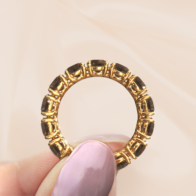 Cette bague porte le nom Vivienne 4.7 et le type de bague s'appelle une bague éternité. Par conséquent, toutes les pierres précieuses sont serties autour de l'anneau de la bague. Cette bague forgée en or jaune 14 Carat a tout autour des petits quartz fumé de 4.7 mm. Les quartz fumé brillants sont tous d'identique et sont sertis dans l'anneau autour de la bague. Tous les quartz fumé sont soigneusement sélectionnés, précisément parce qu'ils doivent être aussi identiques que possible pour créer le meilleur résultat possible sur cette bague. Notre orfèvre place tous les quartz fumé très précisément à la main, ce qui permet de renforcer l'effet éternité de la bague. La passion est ce qui anime nos orfèvres : créer la bague parfaite. Voici la beauté de notre métier ! Le résultat est une belle bague forgée en or jaune exclusives dans laquelle la rangée de quartz fumé semble continuer sans fin. Le symbole parfait pour votre amour infini pour elle ! Voici quelque chose de particulier ! En combinant les dernières techniques modernes, associées à une fabrication ancienne, nous sommes en mesure de fabriquer nos bagues dans notre propre studio. Chaque bijou est fabriqué sur commande. Ceci est avantageux car nous sommes en mesure de vous proposer un prix que vous ne trouverez nulle part ailleurs.Nos designers talentueux ajoutent quotidiennement de nouveaux modèles à notre collection en ligne. Ensemble, ils créent une collection variée des plus beaux bijoux. Si vous préférez créer des bagues selon votre propre conception, n'hésitez pas à demander un devis. Nous vous ferons une offre incroyable, basée sur la qualité et le prix.Pour vous faciliter la tâche, vous pouvez facilement nous retourner tout bijou commandé dans les 30 jours suivant la livraison.