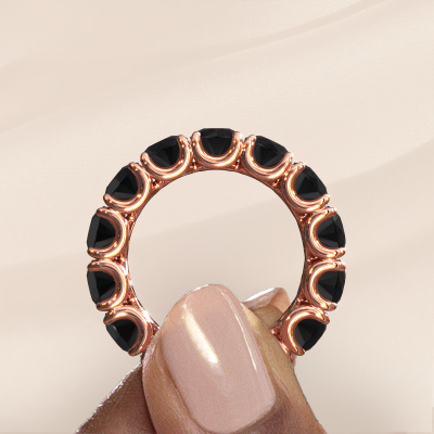 Cette bague porte le nom Estee 5.0 et le type de bague s'appelle une bague éternité. Par conséquent, toutes les pierres précieuses sont serties autour de l'anneau de la bague. Cette bague forgée en or rose 14 Carat a tout autour des petits diamants noirs de 8.40 crt. Les diamants noirs brillants sont tous d'identique et sont sertis dans l'anneau autour de la bague. Tous les diamants noirs sont soigneusement sélectionnés, précisément parce qu'ils doivent être aussi identiques que possible pour créer le meilleur résultat possible sur cette bague. Notre orfèvre place tous les diamants noirs très précisément à la main, ce qui permet de renforcer l'effet éternité de la bague. La passion est ce qui anime nos orfèvres : créer la bague parfaite. Voici la beauté de notre métier ! Le résultat est une belle bague forgée en or rose exclusives dans laquelle la rangée de diamants noirs semble continuer sans fin. Le symbole parfait pour votre amour infini pour elle ! Voici quelque chose de particulier ! Devez-vous respecter un certain budget ? N'hésitez pas à nous contacter, nous serons heureux de vous conseiller sur toutes les possibilités. Dans tous les cas, nous offrons toutes les bagues à un prix que vous ne trouverez nulle part ailleurs, car nous ne fabriquerons la bague uniquement lorsque vous la commanderez. Cela nous permet de vous donner la garantie du meilleur prix.Nos designers talentueux ajoutent quotidiennement de nouveaux modèles à notre collection en ligne. Ensemble, ils créent une collection variée des plus beaux bijoux. Si vous préférez créer des bagues selon votre propre conception, n'hésitez pas à demander un devis. Nous vous ferons une offre incroyable, basée sur la qualité et le prix.Pour vous faciliter la tâche, vous pouvez facilement nous retourner tout bijou commandé dans les 30 jours suivant la livraison.
