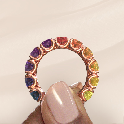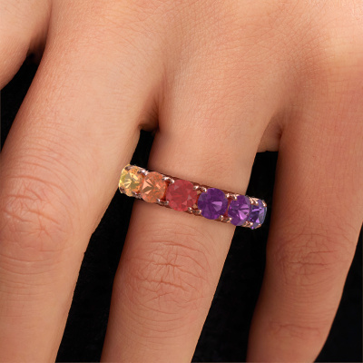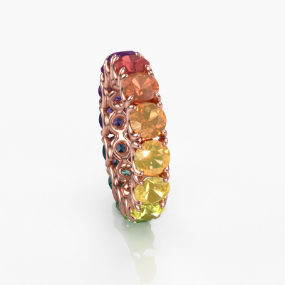 Cette bague porte le nom Estee 5.0 et le type de bague s'appelle une bague éternité. Par conséquent, toutes les pierres précieuses sont serties autour de l'anneau de la bague. Cette bague forgée en or rose 14 Carat a tout autour des petits Rainbow saphir 1 de 5 mm. Les Rainbow saphir 1 brillants sont tous d'identique et sont sertis dans l'anneau autour de la bague. Tous les Rainbow saphir 1 sont soigneusement sélectionnés, précisément parce qu'ils doivent être aussi identiques que possible pour créer le meilleur résultat possible sur cette bague. Notre orfèvre place tous les Rainbow saphir 1 très précisément à la main, ce qui permet de renforcer l'effet éternité de la bague. La passion est ce qui anime nos orfèvres : créer la bague parfaite. Voici la beauté de notre métier ! Le résultat est une belle bague forgée en or rose exclusives dans laquelle la rangée de Rainbow saphir 1 semble continuer sans fin. Le symbole parfait pour votre amour infini pour elle ! Voici quelque chose de particulier ! Devez-vous respecter un certain budget ? N'hésitez pas à nous contacter, nous serons heureux de vous conseiller sur toutes les possibilités. Dans tous les cas, nous offrons toutes les bagues à un prix que vous ne trouverez nulle part ailleurs, car nous ne fabriquerons la bague uniquement lorsque vous la commanderez. Cela nous permet de vous donner la garantie du meilleur prix.Nos designers talentueux ajoutent quotidiennement de nouveaux modèles à notre collection en ligne. Ensemble, ils créent une collection variée des plus beaux bijoux. Si vous préférez créer des bagues selon votre propre conception, n'hésitez pas à demander un devis. Nous vous ferons une offre incroyable, basée sur la qualité et le prix.Pour vous faciliter la tâche, vous pouvez facilement nous retourner tout bijou commandé dans les 30 jours suivant la livraison.