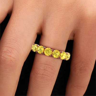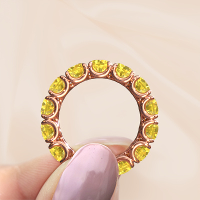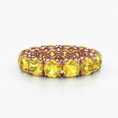 Cette bague porte le nom Estee 4.7 et le type de bague s'appelle une bague éternité. Par conséquent, toutes les pierres précieuses sont serties autour de l'anneau de la bague. Cette bague forgée en or rose 14 Carat a tout autour des petits saphirs jaunes de 4.7 mm. Cette bague éternité pour femmes forgée en or rose est une jolie bague qui rendra votre demande en mariage très spéciale. Les saphirs jaunes brillants sont tous d'identique et sont sertis autour de la bague. Tous les saphirs jaunes sont soigneusement sélectionnés, précisément parce qu'ils doivent être aussi identiques que possible pour créer le meilleur résultat possible sur cette bague. Ce sont des produits de la nature, de sorte qu'il existe encore des différences minimes entre chaque pierre. Mais comme tous nos saphirs jaunes sont placés à la main avec beaucoup de précision par notre orfèvre, l'effet éternité peut être renforcé. Cela demande beaucoup de patience et une main habile, mais fabriquer la bague parfaite pour femmes est une passion qui anime nos orfèvres. Le résultat est une bague magnifique dans laquelle la rangée de saphirs jaunes semble continuer sans fin. Le symbole de votre amour infini pour elle ! Magnifique n'est-ce pas ? En utilisant nos techniques modernes, nous sommes en mesure de concevoir et de personnaliser les bijoux de la plus haute qualité avec le plus grand soin pour vous. Nos bagues ont toujours un prix inférieur de 30% à celles des autres bijoutiers. Nous fabriquons des bagues à la commande afin de ne pas avoir à garder un stock important. Si vous avez un certain budget, nous serons ravis de vous conseiller tout en le respectant.
