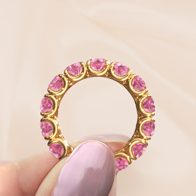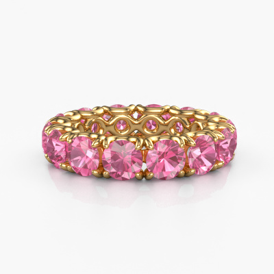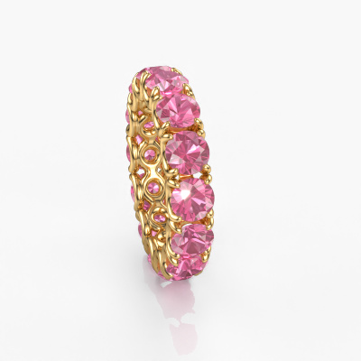 Cette bague porte le nom Estee 4.7 et le type de bague s'appelle une bague éternité. Par conséquent, toutes les pierres précieuses sont serties autour de l'anneau de la bague. Cette bague forgée en or jaune 14 Carat a tout autour des petits saphirs roses de 4.7 mm. Cette bague éternité pour femmes forgée en or jaune est une jolie bague qui rendra votre demande en mariage très spéciale. Les saphirs roses brillants sont tous d'identique et sont sertis autour de la bague. Tous les saphirs roses sont soigneusement sélectionnés, précisément parce qu'ils doivent être aussi identiques que possible pour créer le meilleur résultat possible sur cette bague. Ce sont des produits de la nature, de sorte qu'il existe encore des différences minimes entre chaque pierre. Mais comme tous nos saphirs roses sont placés à la main avec beaucoup de précision par notre orfèvre, l'effet éternité peut être renforcé. Cela demande beaucoup de patience et une main habile, mais fabriquer la bague parfaite pour femmes est une passion qui anime nos orfèvres. Le résultat est une bague magnifique dans laquelle la rangée de saphirs roses semble continuer sans fin. Le symbole de votre amour infini pour elle ! Magnifique n'est-ce pas ? En utilisant nos techniques modernes, nous sommes en mesure de concevoir et de personnaliser les bijoux de la plus haute qualité avec le plus grand soin pour vous. Nos bagues ont toujours un prix inférieur de 30% à celles des autres bijoutiers. Nous fabriquons des bagues à la commande afin de ne pas avoir à garder un stock important. Si vous avez un certain budget, nous serons ravis de vous conseiller tout en le respectant.