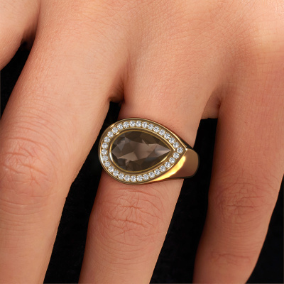 Voulez-vous une bague magnifique et spéciales pour femmes avec une seule pierre précieuse pour attirer tous les regards ? Que pensez-vous de cette bague Latashia ? La bague Latashia montrée ici est forgée en or jaune avec un beau quartz fumé poire de 12x8 mm. Le quartz fumé est soigneusement sélectionné par nos fournisseurs de quartz fumé, puis placé par l'orfèvre dans la bague, conformément à l'artisanat traditionnel. La bague est finie et polie dans les moindres détails jusqu'à ce qu'une bague unique avec un beau quartz fumé ait été créée. Fabriquée spécialement pour vous ! La Latashia est unique car vous pouvez entièrement l'assembler à votre guise.Votre bague personnelle Latashia que vous vous créez est fabriquée avec amour et passion par nos orfèvres. Préféreriez-vous une option autre que la bague en or jaune Latashia présentée ici ? Vous avez alors diverses options possibles via le configurateur. Si vous n'êtes pas complètement sûr(e), nous serons ravis de vous conseiller !En combinant les dernières techniques modernes, associées à une fabrication ancienne, nous sommes en mesure de fabriquer nos bagues dans notre propre studio. Chaque bijou est fabriqué sur commande. Ceci est avantageux car nous sommes en mesure de vous proposer un prix que vous ne trouverez nulle part ailleurs.Pour vous faciliter la tâche, vous pouvez facilement nous retourner tout bijou commandé dans les 30 jours suivant la livraison. Si vous avez une question, consultez notre foire aux questions. Si vous n'êtes pas familier avec le logiciel de configuration, ou si vous avez des souhaits spécifiques pour votre bague personnelle, n'hésitez Latashia pas à nous contacter !