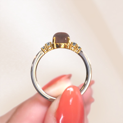 Sur la photo, vous pouvez voir la bague forgée en or blanc Jelke avec un cabochon quartz fumé. Cabochon signifie que le quartz fumé est d'abord affûté en une forme spécifique, telle que la forme d'une goutte, d'un cœur ou une forme cabochon ovale. Puis que des couches sont coupées du haut de la pierre jusqu'à ce que la pierre ait une belle forme convexe. Un bijou avec une pierre précieuse taillée en cabochon est magnifique, attire élégamment tous les regards et correspond parfaitement à un style fantaisie et plus encore à un style vintage. Votre bague osés est finalisée dans les moindres détails par nos orfèvres jusqu'à la création de votre bague unique, dans laquelle le quartz fumé cabochon prend tout son sens. Votre bague personnelle Jelke que vous vous créez est fabriquée avec amour et passion par nos orfèvres. Préféreriez-vous une option autre que la bague en or blanc Jelke présentée ici ? Vous avez alors diverses options possibles via le configurateur. Si vous n'êtes pas complètement sûr(e), nous serons ravis de vous conseiller ! Vous pouvez également graver votre bague. DiamondsByMe se fera un plaisir de le faire pour vous ! En utilisant nos techniques modernes, nous sommes en mesure de concevoir et de personnaliser les bijoux de la plus haute qualité avec le plus grand soin pour vous. Nos bagues ont toujours un prix inférieur de 30% à celles des autres bijoutiers. Nous fabriquons des bagues à la commande afin de ne pas avoir à garder un stock important. Si vous avez un certain budget, nous serons ravis de vous conseiller tout en le respectant.Pour vous faciliter la tâche, vous pouvez facilement nous retourner tout bijou commandé dans les 30 jours suivant la livraison. Vous pouvez bien entendu toujours nous contacter si vous avez besoin de notre aide pour créer votre bague personnelle Jelke osés !