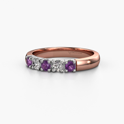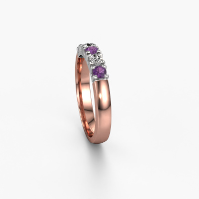 Cette bague style memoire porte le nom de Rianne 5. Ce type de bague s'appelle «Mémoire», car elle est créée avec un profil droit. Cela permet de porter la bague à côté d'autres bagues. Cette bague est en or rose 14 Carat et contient un améthyste associé à une diamant de 2.7 mm serties sur l'anneau. Comme vous pouvez le constater, avec cette belle mémoire pour femmes en or rose, de améthystes sont sertis les uns à côté des autres sur la bague. Le sens de l'mémoire est littéralement de 'travailler ensemble'. Et c’est exactement ce que font ces pierres précieuses : ensemble, elles créent un effet spécial supplémentaire sur l'anneau avec un anneau classiques ! Une belle symbolique pour un anneau, non ? Tous les améthystes soigneusement sélectionnés sont placés à la main par notre maître orfèvre. Un travail très précis, qui tire le meilleur parti de notre combinaison unique d'artisanat pur et des techniques d'orfèvre les plus modernes. Toutes les pierres précieuses doivent être serties exactement de la même manière pour diffuser parfaitement la lumière. Par conséquent, l'orfèvre gardera cette bague sous la lumière pour voir si les améthystes sont placés correctement. Cela demande une main habile et beaucoup de patience, mais le résultat est un véritable chef-d'œuvre. Et c'est ce que nous recherchons ! En combinant les dernières techniques modernes, associées à une fabrication ancienne, nous sommes en mesure de fabriquer nos bagues dans notre propre studio. Chaque bijou est fabriqué sur commande. Ceci est avantageux car nous sommes en mesure de vous proposer un prix que vous ne trouverez nulle part ailleurs.