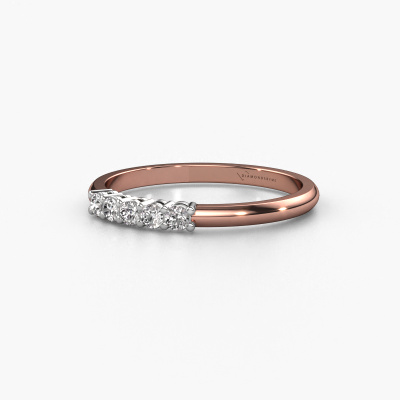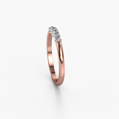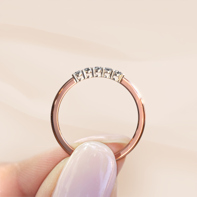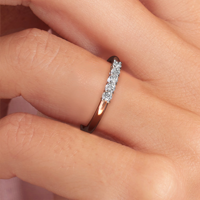 Cette bague style 5 pierres porte le nom de Michelle 5. Ce type de bague s'appelle «Mémoire», car elle est créée avec un profil droit. Cela permet de porter la bague à côté d'autres bagues. Cette bague est en or rose 14 Carat et contient un diamant associé à une diamant synthétique de 0.03 crt serties sur l'anneau. Comme vous pouvez le constater, avec cette belle mémoire pour femmes en or rose, de diamants sont sertis les uns à côté des autres sur la bague. Le sens de l'mémoire est littéralement de 'travailler ensemble'. Et c’est exactement ce que font ces pierres précieuses : ensemble, elles créent un effet spécial supplémentaire sur l'anneau avec un anneau classiques ! Une belle symbolique pour un anneau, non ? Tous les diamants soigneusement sélectionnés sont placés à la main par notre maître orfèvre. Un travail très précis, qui tire le meilleur parti de notre combinaison unique d'artisanat pur et des techniques d'orfèvre les plus modernes. Toutes les pierres précieuses doivent être serties exactement de la même manière pour diffuser parfaitement la lumière. Par conséquent, l'orfèvre gardera cette bague sous la lumière pour voir si les diamants sont placés correctement. Cela demande une main habile et beaucoup de patience, mais le résultat est un véritable chef-d'œuvre. Et c'est ce que nous recherchons ! [Bestp1r_long]