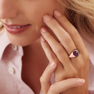 Sur la photo, vous pouvez voir la bague forgée en or rose Zaza avec un cabochon rhodolite. Cabochon signifie que le rhodolite est d'abord affûté en une forme spécifique, telle que la forme d'une goutte, d'un cœur ou une forme cabochon ovale. Puis que des couches sont coupées du haut de la pierre jusqu'à ce que la pierre ait une belle forme convexe. Un bijou avec une pierre précieuse taillée en cabochon est magnifique, attire élégamment tous les regards et correspond parfaitement à un style design et plus encore à un style vintage. Votre bague 1 pierre est finalisée dans les moindres détails par nos orfèvres jusqu'à la création de votre bague unique, dans laquelle le rhodolite cabochon prend tout son sens. Une bague sur mesure design et gracieuse est le cadeau parfait ! De nouveaux designs exquis sont ajoutés quotidiennement par notre équipe d'orfèvres passionnés. Et chaque design peut être personnalisé. Personnalisez simplement les métaux précieux et la couleur des pierres précieuses qui seront utilisées, par exemple. Cela rendra votre design de bague design Zaza vraiment unique ! Vous pouvez également graver votre bague. DiamondsByMe se fera un plaisir de le faire pour vous ! Nos orfèvres ne fabriqueront votre bague qu'une fois que vous l'aurez commandée. Nous ne faisons pas de stock. L'avantage de cela est que nous n'avons pas à inclure les frais de stockage dans nos prix, et nous pouvons donc vous offrir des bijoux à un prix très bas.Pour vous faciliter la tâche, vous pouvez facilement nous retourner tout bijou commandé dans les 30 jours suivant la livraison. Vous pouvez bien entendu toujours nous contacter si vous avez besoin de notre aide pour créer votre bague personnelle Zaza 1 pierre !