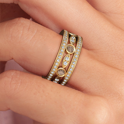 Votre attention est-elle toujours attirée par les articles vintage ? Vous pouvez donc être sûre que cette bague forgée en or jaune vous ira bien ! C'est un nouveau modèle, basé sur des motifs vintage. Un peu de rêve, un beau design ! Surtout si vous l'ajustez encore plus à votre goût. De magnifiques diamants bruns sont utilisés dans cette bague spéciales. Comme vous pouvez le constater, vous pouvez choisir une pierre précieuse qui convient à votre style. Chaque pierre précieuse est soigneusement sélectionnée dans le monde entier par nos commerçants. Notre orfèvre ne veut utiliser que les plus belles pierres précieuses sur un bijou. Après tout, c'est la couronne de son travail ! Nos orfèvres fabriquent votre bague sur mesure, à votre goût et avec beaucoup de passion et de soin. Le or jaune bague comme indiqué ici peut être ajusté à votre guise avec l'outil de configuration. Si vous avez des idées que vous ne pouvez pas appliquer avec l'outil de configuration, vous pouvez toujours les partager à nos créateurs de bijoux. Vous pouvez bien sûr toujours nous poser des questions.Puisque nous concevons et livrons nos propres bijoux, nous sommes en mesure de vous proposer une bague à un prix que vous ne pourrez pas trouver ailleurs. Une alliance est fabriquée sur commande, ce qui permet d'éviter les excédents de matériel et nous permet de vous proposer une superbe offre de prix. Nous comprenons qu'acheter votre bague en ligne soit un risque, mais nous vous assistons volontiers dans le processus de conception, en tenant compte de votre budget.Pour vous faciliter la tâche, vous pouvez facilement nous retourner tout bijou commandé dans les 30 jours suivant la livraison.Voulez-vous plus d'informations sur la bague entourage Jessica ? Jetez un coup d'œil à notre foire aux questions. Bien sûr, vous pouvez toujours contacter notre équipe d'orfèvres passionnés. Nous aimerions créer les bijoux de vos rêves !