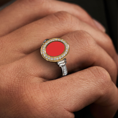 Der 2 Farben Servie 1 Siegelring mit 10x8 mm oval form Rot Emaille Oberfläche, wie oben gezeigt, ist voll von Tradition. Üblicherweise wurde der Siegelring vom Vater an den Sohn weitergegeben. Beginnen Sie Ihre eigene Tradition mit diesem 2 Farben, Weißgold Siegelring. Wir würden uns auch sehr freuen, Ihren Ring mit einem Monogramm oder einem Familienwappen gravieren zu dürfen. Bitte sehen Sie sich unsere Datenbank für weitere Anfragen und Optionen an. Sie können die Datenbank am unteren Rand dieser Seite finden. Beginnen Sie eine neue Tradition mit dem design Weißgold Servie 1 Siegelring. Wie gefällt Ihnen dieser design Weißgold Siegelring? Passen Sie diesen Servie 1 Siegelring einfach mit unserem Online-Tool an. Anschließend wird Ihr persönlicher, besondere Servie 1 Siegelring in Handarbeit von unseren Goldschmieden angefertigt. Edelmetalle und Edelsteine können nach Ihren Wünschen angepasst werden. Haben Sie spezielle Wünsche, die in unserem Online-Tool nicht verfügbar sind? Setzen Sie sich mit uns in Verbindung. Wir passen Ihren persönlichen design Siegelring nach Ihren Wünschen an.Unser Team von talentierten, leidenschaftlichen Designern fügt unserer Online-Kollektion täglich neue Ring-Designs hinzu. Unser Ziel dabei ist es, Ihnen eine große Vielfalt an Schmuckstücken anbieten zu können. Bitte zögern Sie nicht, ein Angebot anzufordern, wenn Sie spezielle Wünsche für Ihren Ring haben. Wir garantieren Ihnen ein Angebot, das Sie nicht ablehnen können.Nach Erhalt Ihrer Bestellung beginnen unsere Goldschmiede mit Leidenschaft den kreativen Prozess und fertigen Ihren Ring in unserem eigenen Studio. Da wir keine großen Lager haben, werden diese Kosten nicht an Sie weitergegeben. Unsere Preisgestaltung ist der Beweis dafür! Wir bieten Schmuck zum niedrigsten Preis, garantiert.Um es einfacher zu machen, bieten wir eine kostenlose 30-tägige Rücksendung.