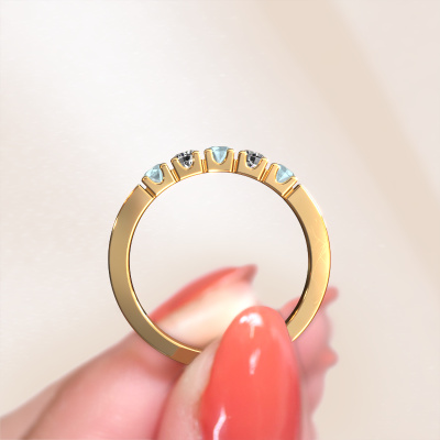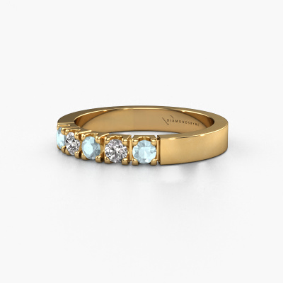 Dieser 5 Stone Ring wird Dana 5 genannt. Diese Art von Ring wird als Memoire ring bezeichnet, da seine Edelsteine in einer durchgehenden Linie angeordnet sind. Dadurch kann er einfach mit anderen Ringen kombiniert werden. Das Band dieses 14 Karat Gold Ring ist in einer Kombination aus Aquamarin und Diamant besetzt. Sie können ganz einfach online die Kombination auswählen, die Sie bevorzugen. Wie Sie sehen, wird bei diesem Gold Memoire Ring mehre Aquamarins gesetzt. Der Memoire ring steht für Zusammenwirken. Und genau das tun diese Edelsteine, zusammenwirken. Zusammen geben sie dem Band eines moderne Ring einen schönen Effekt! So ein bedeutungsvoller Ring, finden Sie nicht auch? Alle von uns ausgesuchten Aquamarins werden von unserem erfahrenen Goldschiede in Handarbeit eingefasst. Das ist eine präzise Aufgabe, die nur durch die Kombination von purer Handwerkskunst und dem Einsatz neuester Techniken erfolgreich durchgeführt werden kann, um eine optimale Wirkung zu erzielen. Um eine perfekte Lichtreflexion zu erzeugen, müssen alle Edelsteine auf die gleiche Weise perfekt ausgerichtet sein. Während der Fertigung wird der Goldschmied Meister daher ständig die Lichtreflexion überwachen, um zu gewährleisten, dass die Aquamarins perfekt ausgerichtet sind. Das erfordert eine geschickte Hand und viel Geduld, aber dann wird das Endprodukt zu einem echten Kunstwerk. Und genau das ist unsere Mission!Da wir unsere eigenen Ringe entwerfen und liefern, können wir Ihnen einen Ring zu einem Preis anbieten, den Sie nirgendwo anders finden. Ein Ring wird auf Bestellung angefertigt, wodurch kein überschüssiges Material anfällt. So können wir Ihnen ein gutes Angebot zum besten Preis machen. Wir verstehen, dass es sich riskant anfühlt, Ihren Ring online zu kaufen. Jedoch helfen wir Ihnen gerne beim Designprozess unter Berücksichtigung Ihres Budgets.Unsere Online-Kollektion wird täglich um neue Schmuckdesigns ergänzt. Unser Team von leidenschaftlichen Designern ist bemüht, außergewöhnliche und vielfältige Designs zu kreieren. Haben Sie einen Ring gesehen, der Ihnen gefällt? Setzen Sie sich mit uns in Verbindung. Basierend auf einem guten Preis/Leistungsverhältnis machen wir Ihnen ein Angebot, das Sie nicht ablehnen können!Um es einfacher zu machen, bieten wir eine kostenlose 30-tägige Rücksendung.