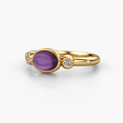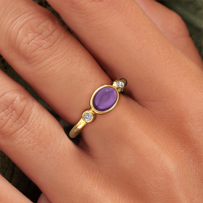 In diesem Foto ist der Gold Liane Ring mit einem 7x5 mm oval cabochon Amethyst besetzt. Cabochon bedeutet, dass ein Amethyst zuerst geformt, nicht facettiert wird. Nämlich in eine bestimmte Form wie einen Tropfen, ein Herz oder ein oval cabochon. Anschließend wird er poliert, bis der Edelstein eine Runde Oberfläche hat. Ein Cabochon-Edelstein ist ein atemberaubender, nobler Blickfang, der perfekt zu einem zeitgenössischen wie auch zu einem Vintage-Stil passt. Unsere erfahrenen Goldschmiede formen den zierliche Ring bis zur Perfektion und machen ihn einzigartig. Der Cabochon Amethyst ist so gefasst, dass seine einzigartigen Qualitäten verstärkt werden. Unsere Goldschmiede kreieren Ihren individuellen Ring leidenschaftlich, mit größter Sorgfalt und nach Ihren Wünschen. Das Gold Ring, wie hier abgebildet, kann mit unserem Online-Tool individuell angepasst werden. Bitte fragen Sie unsere Schmuckdesigner um Hilfe, wenn Sie Änderungen wünsche, die in unserem Online-Tool nicht verfügbar sind. Gerne beantworten wir Ihnen alle offenen Fragen.Durch die Kombination modernster Technik mit uralter Handwerkskunst können wir alle Ringe in unserem eigenen Studio anfertigen. Jedes Schmuckstück wird auf Anfrage gefertigt. Das ist vorteilhaft, weil wir Ihnen dadurch einen Preis anbieten können, den Sie nirgendwo anders finden.Um es einfacher zu machen, bieten wir eine kostenlose 30-tägige Rücksendung.