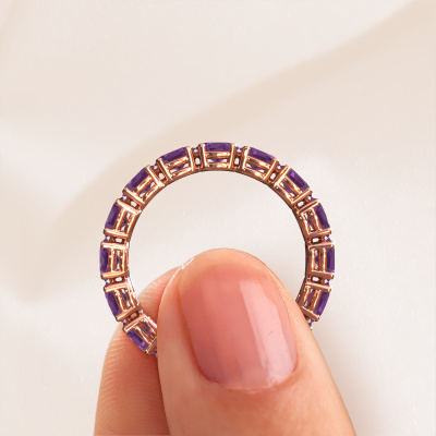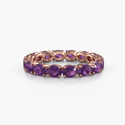 Das ist unser Vivienne OVL 4x3-Ring. Dieser spezielle Typ wird als Eternity ring bezeichnet und ist mit einer durchgehenden Linie von identisch geschliffenen Edelsteinen besetzt. Er ist aus 14 Karat Roségold und mit kleineren Amethyst 4x3 mm besetzt. Dieser Roségold Eternity Ring ist eine wunderschöne und sinnvolle Möglichkeit, Ihrem Antrag eine besondere Note zu verleihen. Die herrlich gleichmäßig geformten Amethysten sind rund um den Ring eingefasst. Die identischen Amethysten werden sorgfältig ausgewählt, um dem Ring eine maximale Wirkung zu verleihen. Denken Sie daran, dass wir natürliche Ressourcen verwenden. Daher sind kleine Unterschiede zwischen den Steinen üblich. Der besondere Effekt wird durch die präzise Positionierung der Amethysten noch verstärkt. Dies erfordert äußerste Präzision und eine geschickte Hand. Für unsere erfahrenen Juweliere ist die pure Leidenschaft. Am Ende bekommen Sie einen Ring mit einer Reihe von Amethysten, die weder Anfang noch Ende zu haben scheinen. Das perfekte Symbol für Ihre Liebe zu ihr! Ist sie nicht eine Schönheit? Da wir unsere eigenen Ringe entwerfen und liefern, können wir Ihnen einen Ring zu einem Preis anbieten, den Sie nirgendwo anders finden. Ein Ring wird auf Bestellung angefertigt, wodurch kein überschüssiges Material anfällt. So können wir Ihnen ein gutes Angebot zum besten Preis machen. Wir verstehen, dass es sich riskant anfühlt, Ihren Ring online zu kaufen. Jedoch helfen wir Ihnen gerne beim Designprozess unter Berücksichtigung Ihres Budgets.Unser Team von talentierten, leidenschaftlichen Designern fügt unserer Online-Kollektion täglich neue Ringe-Designs hinzu. Unser Ziel dabei ist es, Ihnen eine große Vielfalt an Schmuckstücken anbieten zu können. Bitte zögern Sie nicht, ein Angebot anzufordern, wenn Sie spezielle Wünsche für Ihren Ring haben. Wir garantieren Ihnen ein Angebot, das Sie nicht ablehnen können.Um es einfacher zu machen, bieten wir eine kostenlose 30-tägige Rücksendung.