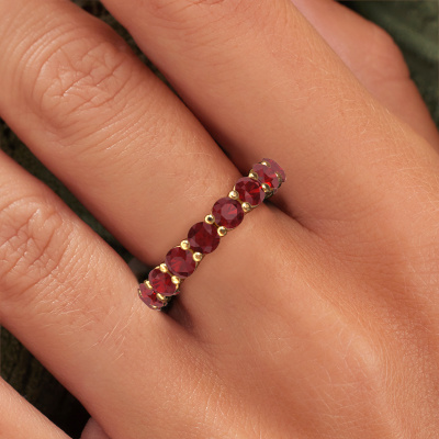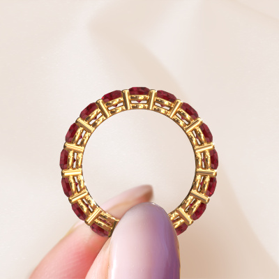 Das ist unser Michelle full 3.7-Ring. Dieser spezielle Typ wird als eternity Ring bezeichnet und ist mit einer durchgehenden Linie von identisch geschliffenen Edelsteinen besetzt. Er ist aus 14 Karat Gold und mit kleineren 3.7 mm Rubin besetzt. Die erstaunlichen Rubin sind identisch in der Größe und im Ringband platziert. Unsere Rubin werden sorgfältig ausgewählt, damit sie identisch sind und somit das beste Ergebnis erzielen. Um das beste Ergebnis zu erzielen, positioniert unser Juwelier alle Rubin von Hand und mit größter Sorgfalt. Unsere Juweliere haben nur ein Ziel, nämlich den perfekten Ring zu kreieren. Deshalb lieben wir, was wir tun. Am Ende bekommen Sie einen atemberaubenden, moderne Gold Vorsteckring mit einer Reihe von Rubin, die weder Anfang noch Ende zu haben scheinen. Das perfekte Symbol für Ihre unsterbliche Liebe zu ihr! Ist sie nicht eine Schönheit? Da wir unsere eigenen Ringe entwerfen und liefern, können wir Ihnen einen Ring zu einem Preis anbieten, den Sie nirgendwo anders finden. Ein Ring wird auf Bestellung angefertigt, wodurch kein überschüssiges Material anfällt. So können wir Ihnen ein gutes Angebot zum besten Preis machen. Wir verstehen, dass es sich riskant anfühlt, Ihren Ring online zu kaufen. Jedoch helfen wir Ihnen gerne beim Designprozess unter Berücksichtigung Ihres Budgets.Unser Team von talentierten, leidenschaftlichen Designern fügt unserer Online-Kollektion täglich neue Ringe-Designs hinzu. Unser Ziel dabei ist es, Ihnen eine große Vielfalt an Schmuckstücken anbieten zu können. Bitte zögern Sie nicht, ein Angebot anzufordern, wenn Sie spezielle Wünsche für Ihren Ring haben. Wir garantieren Ihnen ein Angebot, das Sie nicht ablehnen können.Um es einfacher zu machen, bieten wir eine kostenlose 30-tägige Rücksendung.