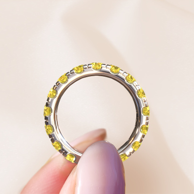 Das ist unser Jackie 3.7-Ring. Dieser spezielle Typ wird als eternity Ring bezeichnet und ist mit einer durchgehenden Linie von identisch geschliffenen Edelsteinen besetzt. Er ist aus Platin und mit kleineren 3.7 mm Gelb Saphir besetzt. Die erstaunlichen Gelb Saphir sind identisch in der Größe und im Ringband platziert. Unsere Gelb Saphir werden sorgfältig ausgewählt, damit sie identisch sind und somit das beste Ergebnis erzielen. Um das beste Ergebnis zu erzielen, positioniert unser Juwelier alle Gelb Saphir von Hand und mit größter Sorgfalt. Unsere Juweliere haben nur ein Ziel, nämlich den perfekten Ring zu kreieren. Deshalb lieben wir, was wir tun. Am Ende bekommen Sie einen atemberaubenden, moderne Platin Vorsteckring mit einer Reihe von Gelb Saphir, die weder Anfang noch Ende zu haben scheinen. Das perfekte Symbol für Ihre unsterbliche Liebe zu ihr! Ist sie nicht eine Schönheit? Mit unserer modernen Technik können wir Schmuckstücke von höchster Qualität mit größter Sorgfalt für Sie entwerfen und anpassen. Unsere Ringe sind immer um 30 Prozent günstiger als bei anderen Juwelieren. Wir fertigen Ringe auf Bestellung, also müssen wir keine großen Lager unterhalten. Wenn Sie ein bestimmtes Budget haben, beraten wir Sie gerne entsprechend.Unsere Online-Kollektion wird täglich um neue Schmuckdesigns ergänzt. Unser Team von leidenschaftlichen Designern ist bemüht, außergewöhnliche und vielfältige Designs zu kreieren. Haben Sie einen Ring gesehen, der Ihnen gefällt? Setzen Sie sich mit uns in Verbindung. Basierend auf einem guten Preis/Leistungsverhältnis machen wir Ihnen ein Angebot, das Sie nicht ablehnen können!Um es einfacher zu machen, bieten wir eine kostenlose 30-tägige Rücksendung.