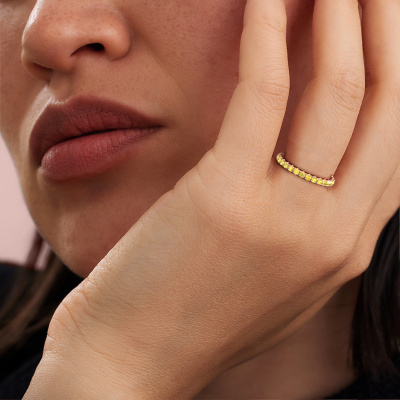 Das ist unser Jackie 2.0-Ring. Dieser spezielle Typ wird als eternity Ring bezeichnet und ist mit einer durchgehenden Linie von identisch geschliffenen Edelsteinen besetzt. Er ist aus 14 Karat Roségold und mit kleineren 2 mm Gelb Saphir besetzt. Die erstaunlichen Gelb Saphir sind identisch in der Größe und im Ringband platziert. Unsere Gelb Saphir werden sorgfältig ausgewählt, damit sie identisch sind und somit das beste Ergebnis erzielen. Um das beste Ergebnis zu erzielen, positioniert unser Juwelier alle Gelb Saphir von Hand und mit größter Sorgfalt. Unsere Juweliere haben nur ein Ziel, nämlich den perfekten Ring zu kreieren. Deshalb lieben wir, was wir tun. Am Ende bekommen Sie einen atemberaubenden, moderne Roségold Vorsteckring mit einer Reihe von Gelb Saphir, die weder Anfang noch Ende zu haben scheinen. Das perfekte Symbol für Ihre unsterbliche Liebe zu ihr! Ist sie nicht eine Schönheit? Mit unserer modernen Technik können wir Schmuckstücke von höchster Qualität mit größter Sorgfalt für Sie entwerfen und anpassen. Unsere Ringe sind immer um 30 Prozent günstiger als bei anderen Juwelieren. Wir fertigen Ringe auf Bestellung, also müssen wir keine großen Lager unterhalten. Wenn Sie ein bestimmtes Budget haben, beraten wir Sie gerne entsprechend.Unsere Online-Kollektion wird täglich um neue Schmuckdesigns ergänzt. Unser Team von leidenschaftlichen Designern ist bemüht, außergewöhnliche und vielfältige Designs zu kreieren. Haben Sie einen Ring gesehen, der Ihnen gefällt? Setzen Sie sich mit uns in Verbindung. Basierend auf einem guten Preis/Leistungsverhältnis machen wir Ihnen ein Angebot, das Sie nicht ablehnen können!Um es einfacher zu machen, bieten wir eine kostenlose 30-tägige Rücksendung.